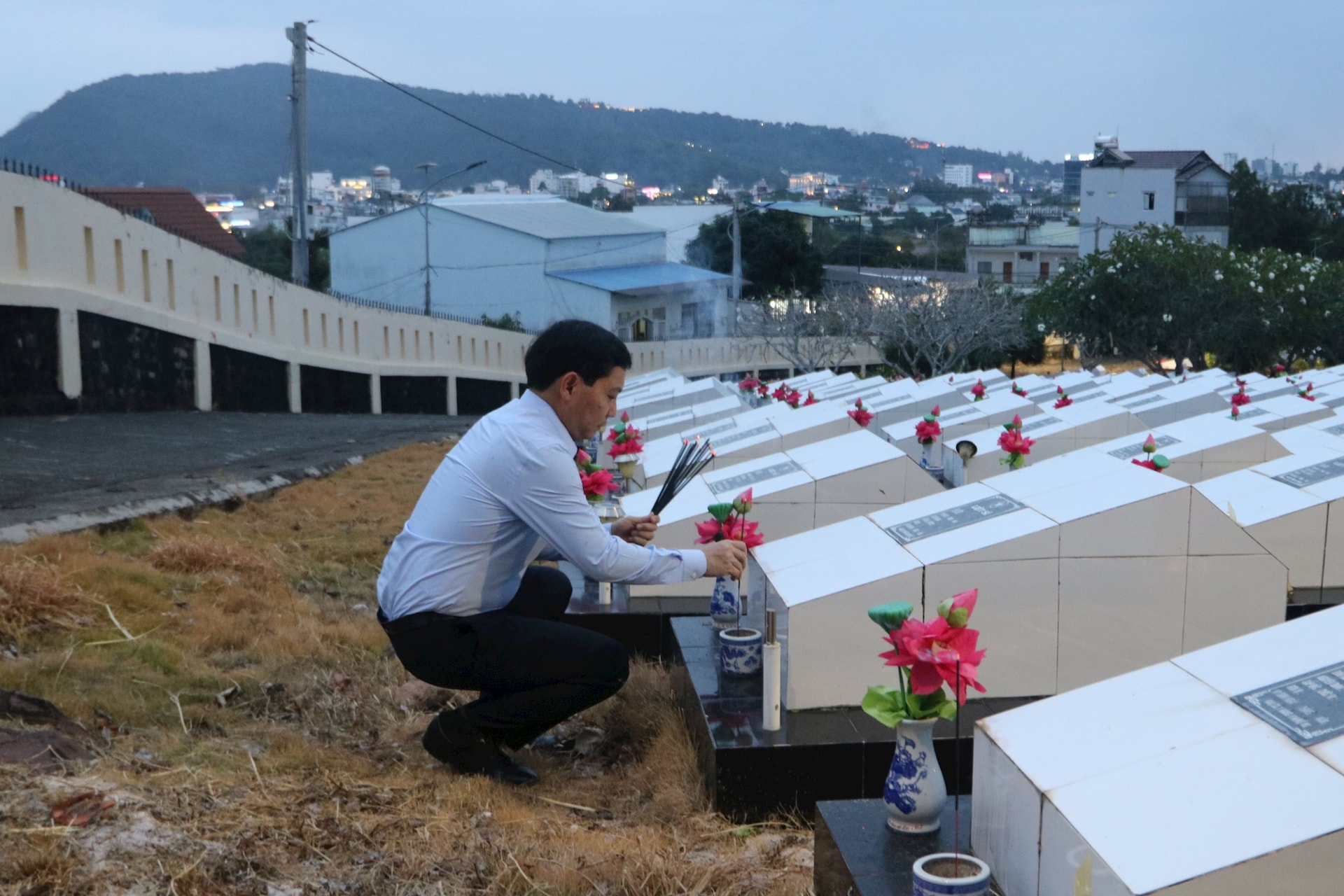 Tổng Biên tập Báo Công lý Trần Đức Vinh thắp hương tại các mộ phần liệt sĩ trong Nghĩa trang Liệt sĩ Phú Quốc