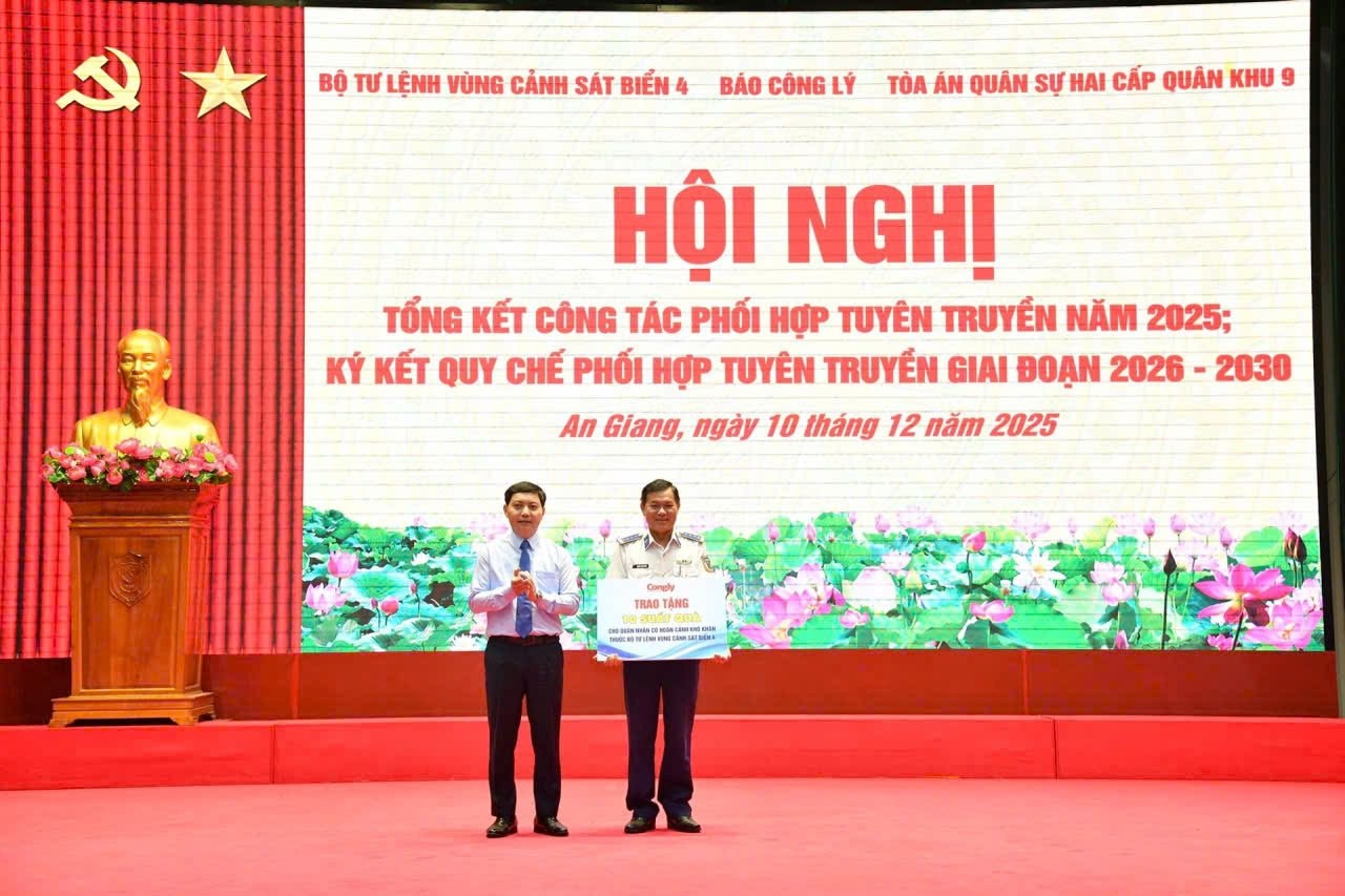 Trước đó, tại buổi lễ ký kết Chương trình phối hợp giai đoạn 2026 – 2030 giữa Bộ Tư lệnh Vùng Cảnh sát biển 4 và Báo Công lý, Báo Công lý đã trao tặng 10 phần quà cho quân nhân đang công tác tại BTL Vùng Cảnh sát biển 4 có hoàn cảnh khó khăn.
