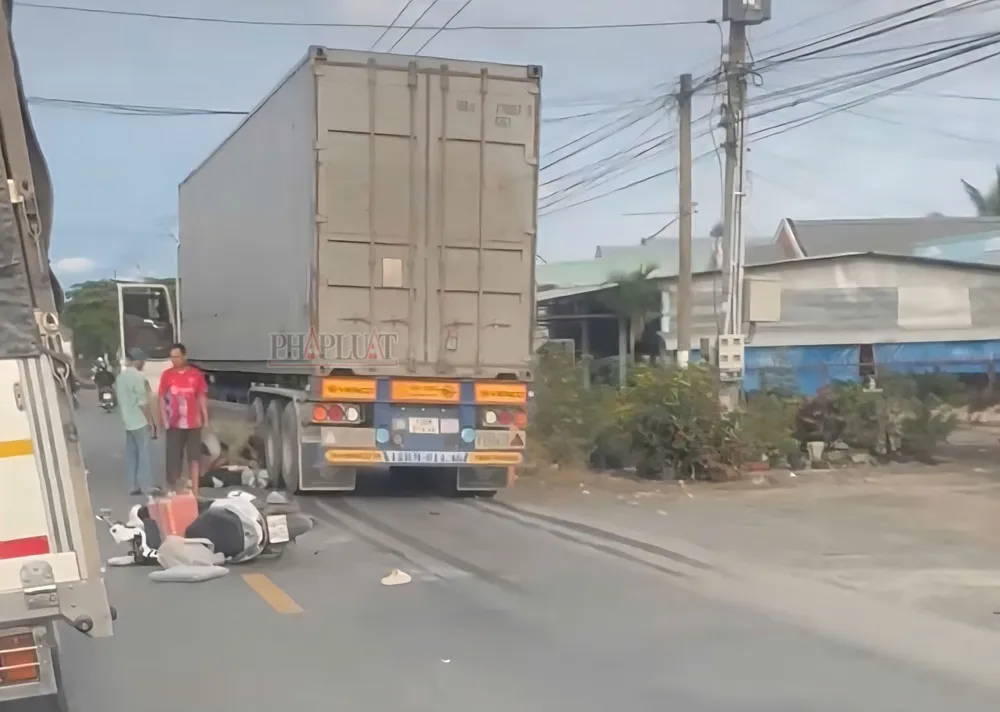 Đúng lúc đó, một xe container chạy cùng chiều từ phía sau trờ tới. Bất ngờ trước tình huống, tài xế kịp thời phanh gấp, song bánh sau vẫn cán trúng tay một cô gái. Người còn lại cũng bị thương do va chạm mạnh. Chiếc xe máy hư hỏng nặng, nhiều bộ phận bị vỡ nát.