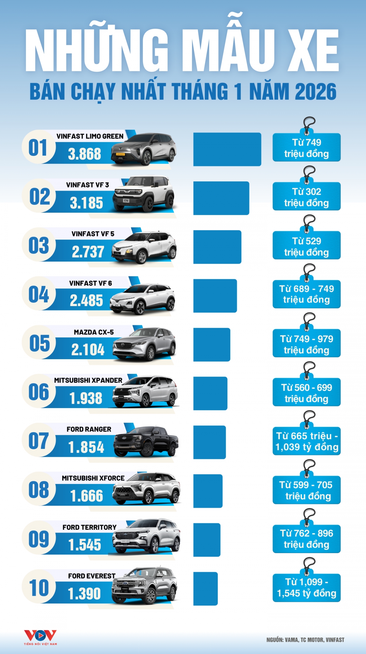 Top 10 mẫu xe bán chậm nhất tháng 1/2026: Lộ diện nhiều gương mặt mới