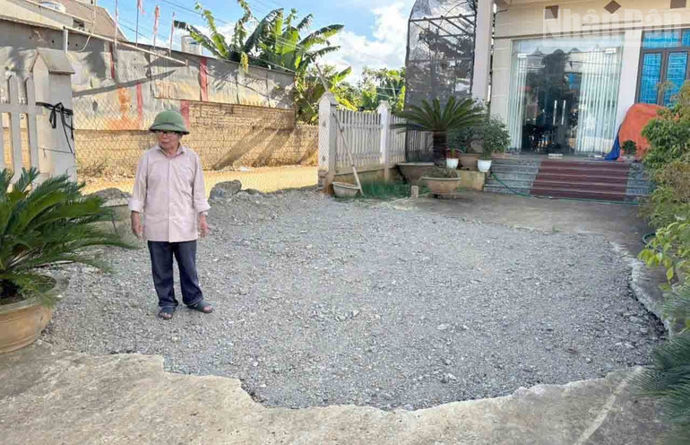 Khu vực sân của một hộ dân bị sụt lún đã được đổ đất đá trám lại.