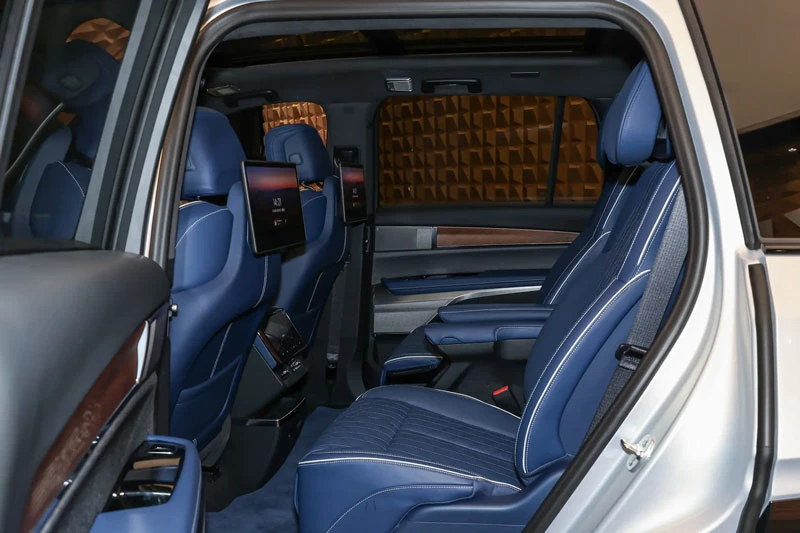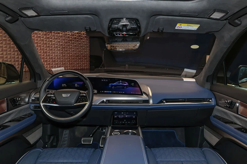 Không gian nội thất của Escalade EV tiếp tục thể hiện đẳng cấp với màn hình cong kích thước lớn 33 inch trải dài bảng táp-lô, kết hợp hệ thống âm thanh cao cấp AKG Studio 23 loa mang lại trải nghiệm giải trí như rạp hát. Các chức năng chỉnh ghế, sưởi và thông gió được tích hợp trực tiếp trên bảng điều khiển cửa, trong khi hàng ghế thứ hai có thêm màn hình điều khiển trung tâm 8 inch cùng màn hình giải trí riêng biệt.