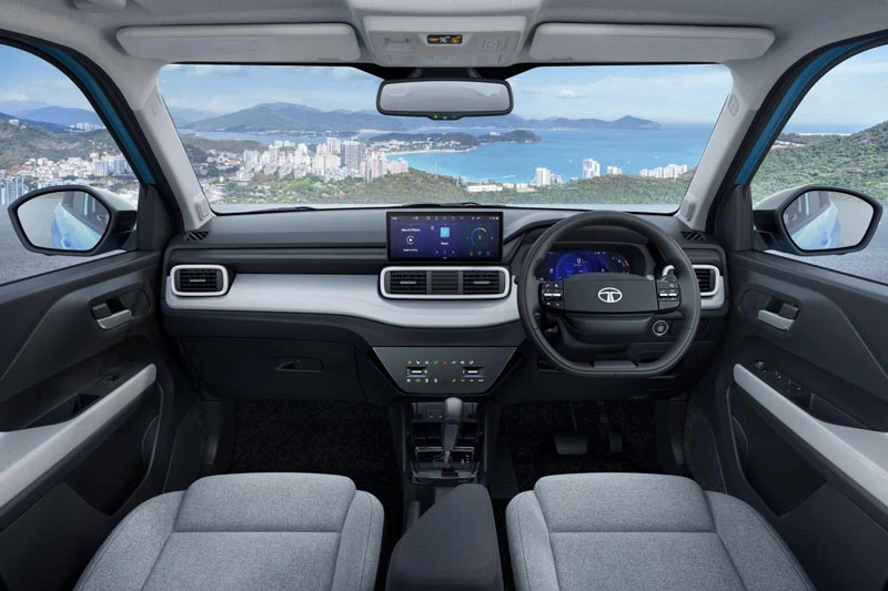 Không gian nội thất của Tata Punch 2026 được cải tiến theo hướng tiện nghi và thân thiện hơn với người dùng. Khoang cabin sử dụng tông màu hai màu trẻ trung, vô-lăng hai chấu mới, cụm đồng hồ kỹ thuật số hiện đại và bảng điều khiển trung tâm tích hợp màn hình cảm ứng độc lập kích thước 10,25 inch, hỗ trợ Apple CarPlay và Android Auto không dây.