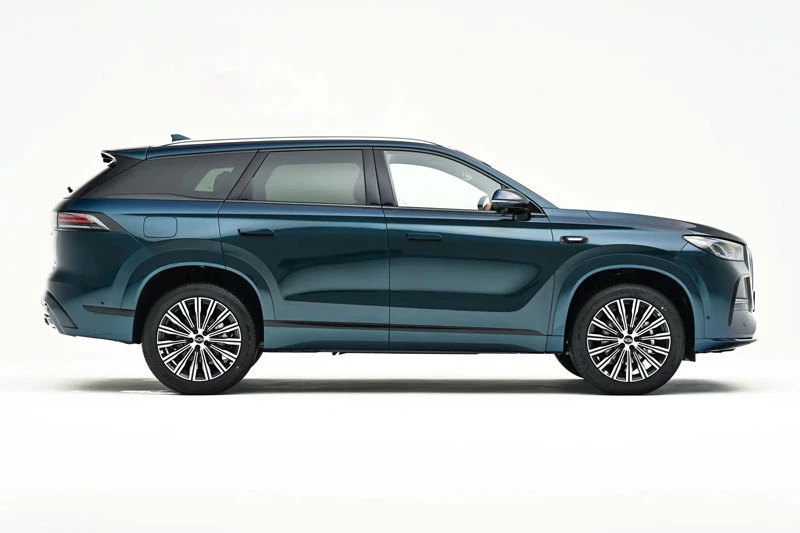 Thân xe có thiết kế chuẩn SUV cỡ trung với hiệu ứng mái nổi nhờ các trụ B, C, D được làm ẩn, kết hợp tay nắm cửa ẩn dạng pop-out và bộ mâm hợp kim đa chấu 20 inch, mang lại diện mạo hiện đại và năng động. Xe sở hữu kích thước 4.853x1.930x1.718 mm, chiều dài cơ sở 2.820 mm đảm bảo không gian rộng rãi cho cả gia đình.
