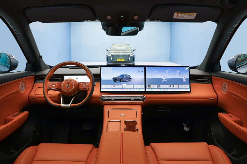 Khoang cabin của Hongqi HS6 2026 được thiết kế theo phong cách tối giản và công nghệ cao. Cụm bảng đồng hồ kỹ thuật số toàn phần kết hợp với hai màn hình cảm ứng trung tâm tạo hiệu ứng hiển thị đồng nhất. Cần số truyền thống được thay bằng lẫy chuyển số sau vô lăng, giúp mở rộng không gian trung tâm.