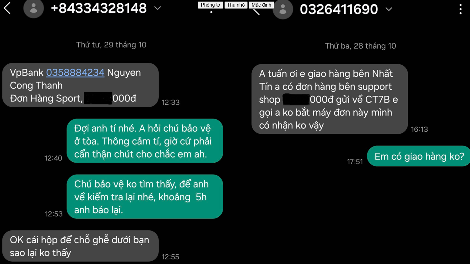 Khoảng 12 giờ 30 phút ngày 29-10, tôi nhận được cuộc gọi từ số điện thoại 0334.328.148, đối tượng tiếp tục nhận là “nhân viên” của Nhất Tín Logistics và đang ở địa chỉ nhà tôi để giao đơn hàng trên. Đang giờ nghỉ trưa nên tôi trao đổi ngắn gọn, nói đối tượng gửi hàng ở bảo vệ tòa nhà và nhắn số tài khoản để chuyển tiền. Đối tượng này nhắn cho tôi số tài khoản của Ngân hàng Thương mại Cổ phần Việt Nam Thịnh Vượng (VPBank) là 0358884234. Tôi đã toan chuyển tiền nhưng như có điều gì mách bảo nên gọi điện thoại nhờ bảo vệ tòa nhà kiểm tra gói hàng, song không thấy. Tôi nhắn tin trao đổi thêm và hẹn đi làm về kiểm tra, chuyển tiền sau. Dù không thúc giục chuyển tiền ngay nhưng đối tượng lại trả lời “đã báo kho giao hàng thành công, nếu thanh toán muộn sẽ bị phạt cả nửa tháng lương” nhằm đánh vào lòng thương cảm của người mua hàng. Chiều về, tôi tìm đơn hàng nhưng không thấy và liên hệ lại với số điện thoại trên song không được. Xâu chuỗi lại các sự việc và kiểm tra thông tin đơn hàng trên website của đơn vị vận chuyển, lúc này tôi mới phát hiện ra mình bị lừa và chỉ may mắn thoát “bẫy”.