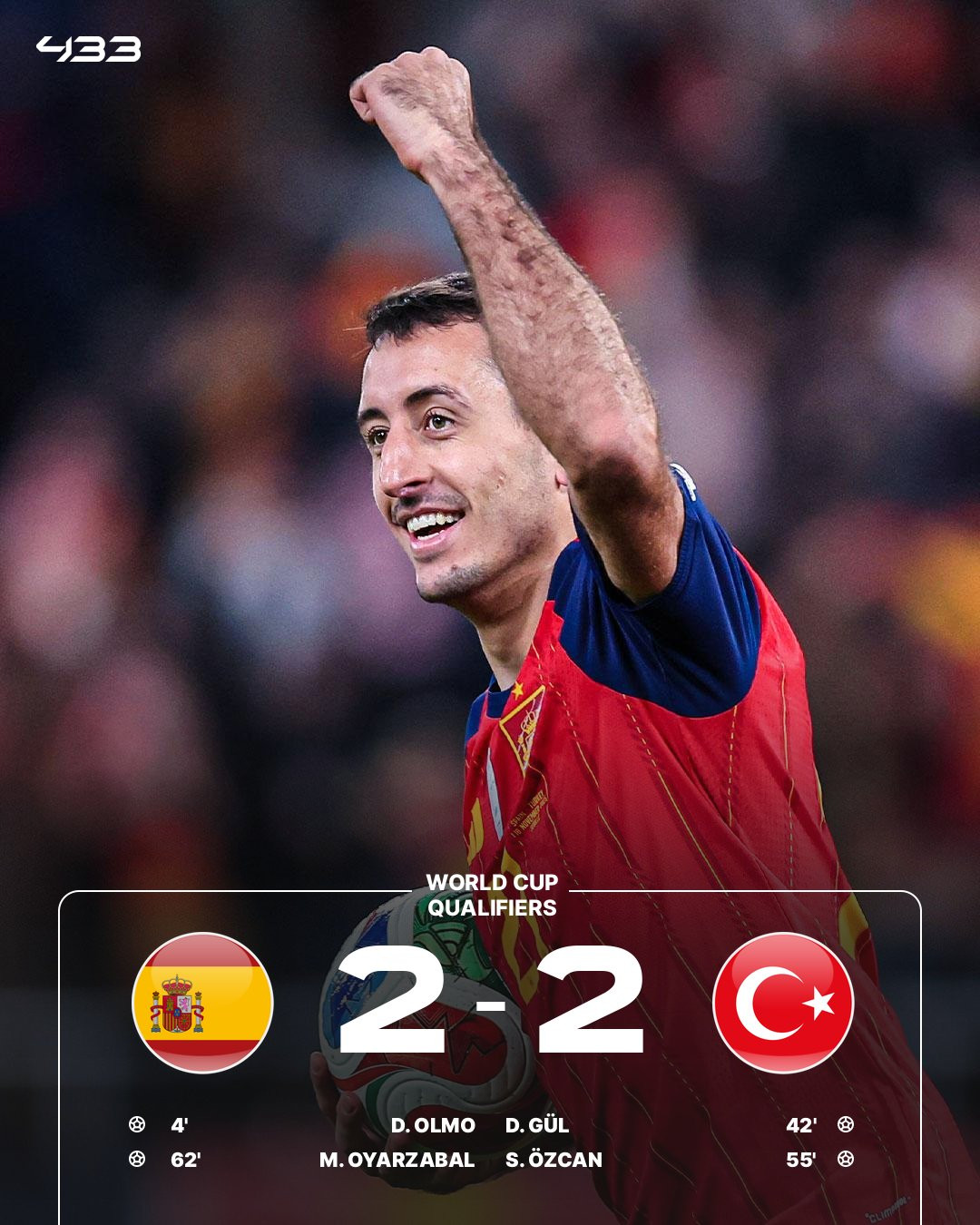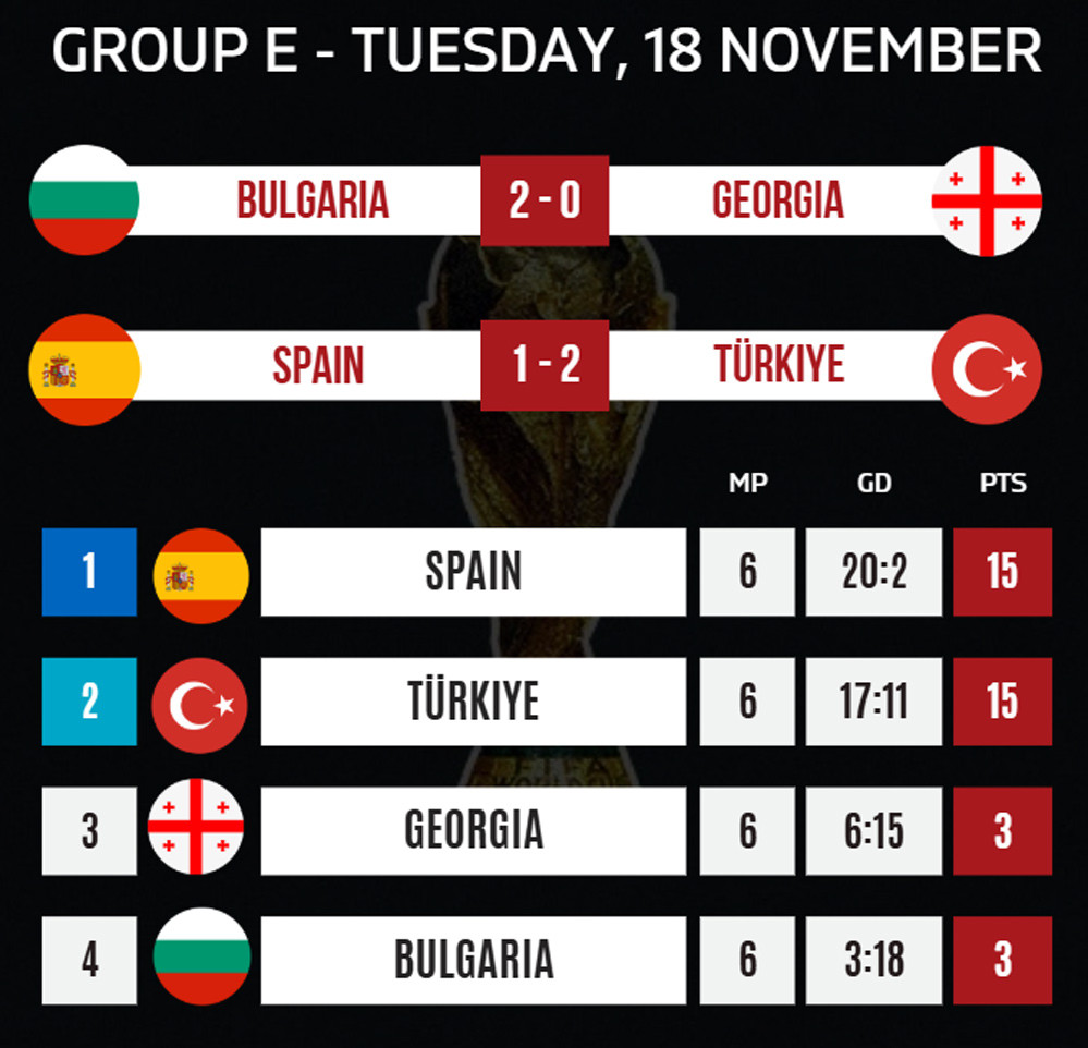 Tây Ban Nha giành vé trực tiếp bảng E dự VCK World Cup 2026. Trong khi Thổ Nhĩ Kỳ sẽ phải đá play-off khu vực châu Âu