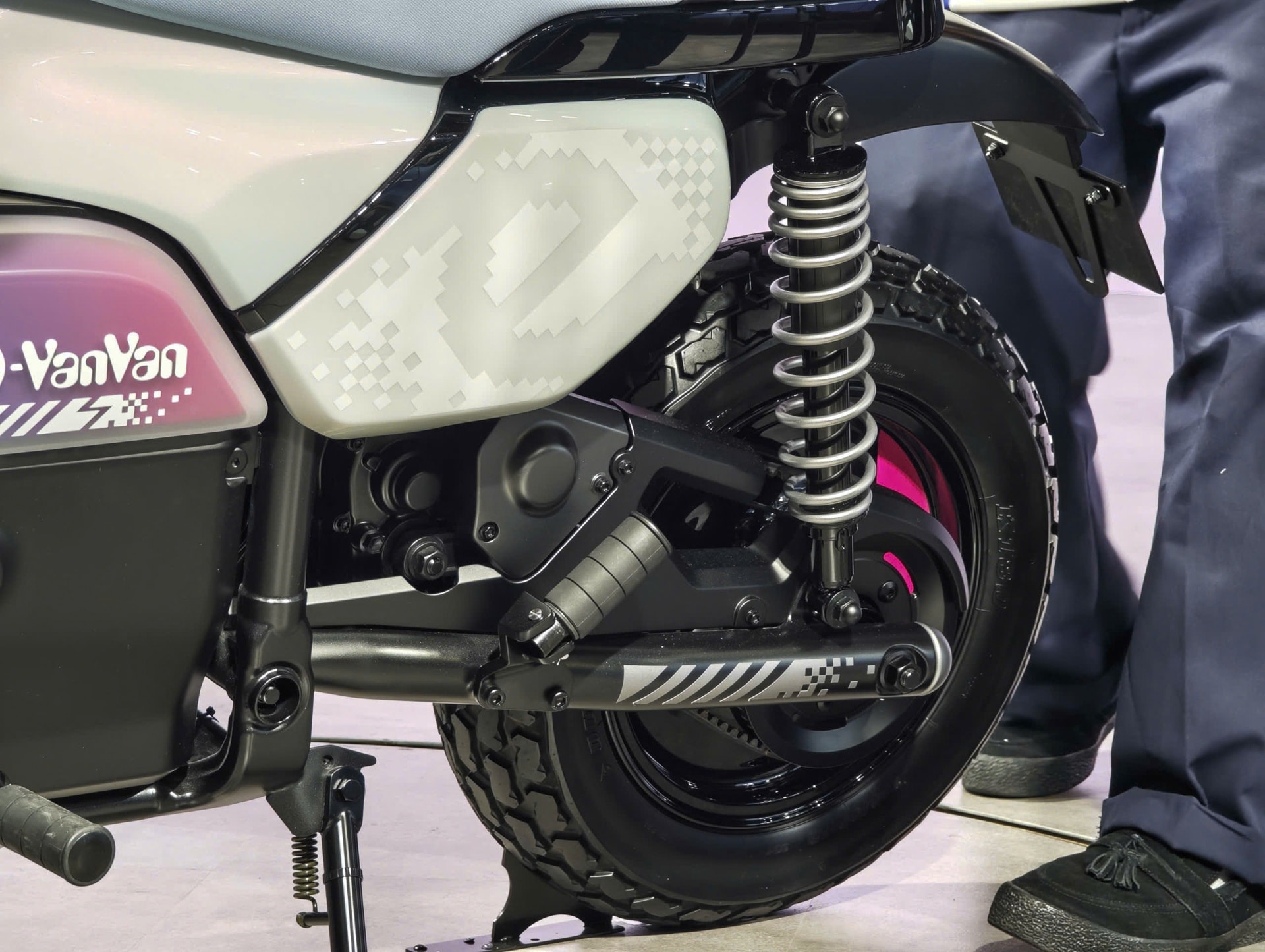Suzuki e-VanVan được trang bị những thành phần khung gầm chắc chắn, hướng đến sự ổn định và an toàn. Xe sử dụng hệ thống giảm xóc trước dạng phuộc ống lồng và giảm xóc sau dạng lò xo đơn, một cấu hình quen thuộc và hiệu quả. Một trong những đặc điểm nổi bật thừa hưởng từ dòng VanVan là bộ lốp to bản, không chỉ tăng cường vẻ ngoài mạnh mẽ mà còn cải thiện độ bám đường trên nhiều loại địa hình.