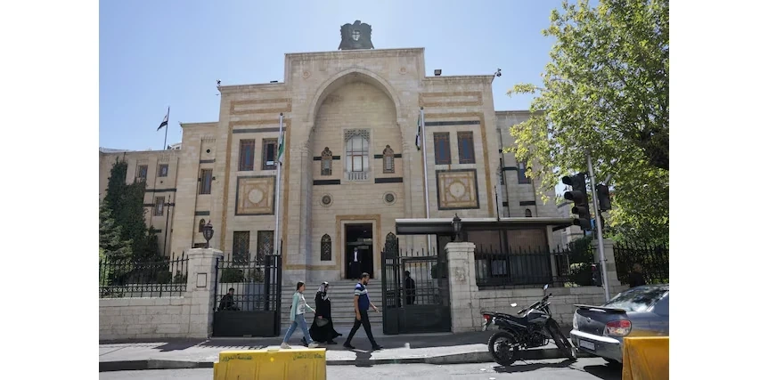 Một nhóm dân thường đi ngang qua cổng chính của tòa nhà Quốc hội Syria ở thủ đô Damascus, ngày 3/9/2025. Ảnh: REUTERS/Khalil Ashawi