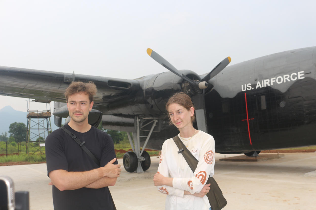 Anh Sebastiaan và chị Megan (quốc tịch Hà Lan) tham quan, tìm hiểu các hiện vật chiến tranh tại Sân bay Tà Cơn.