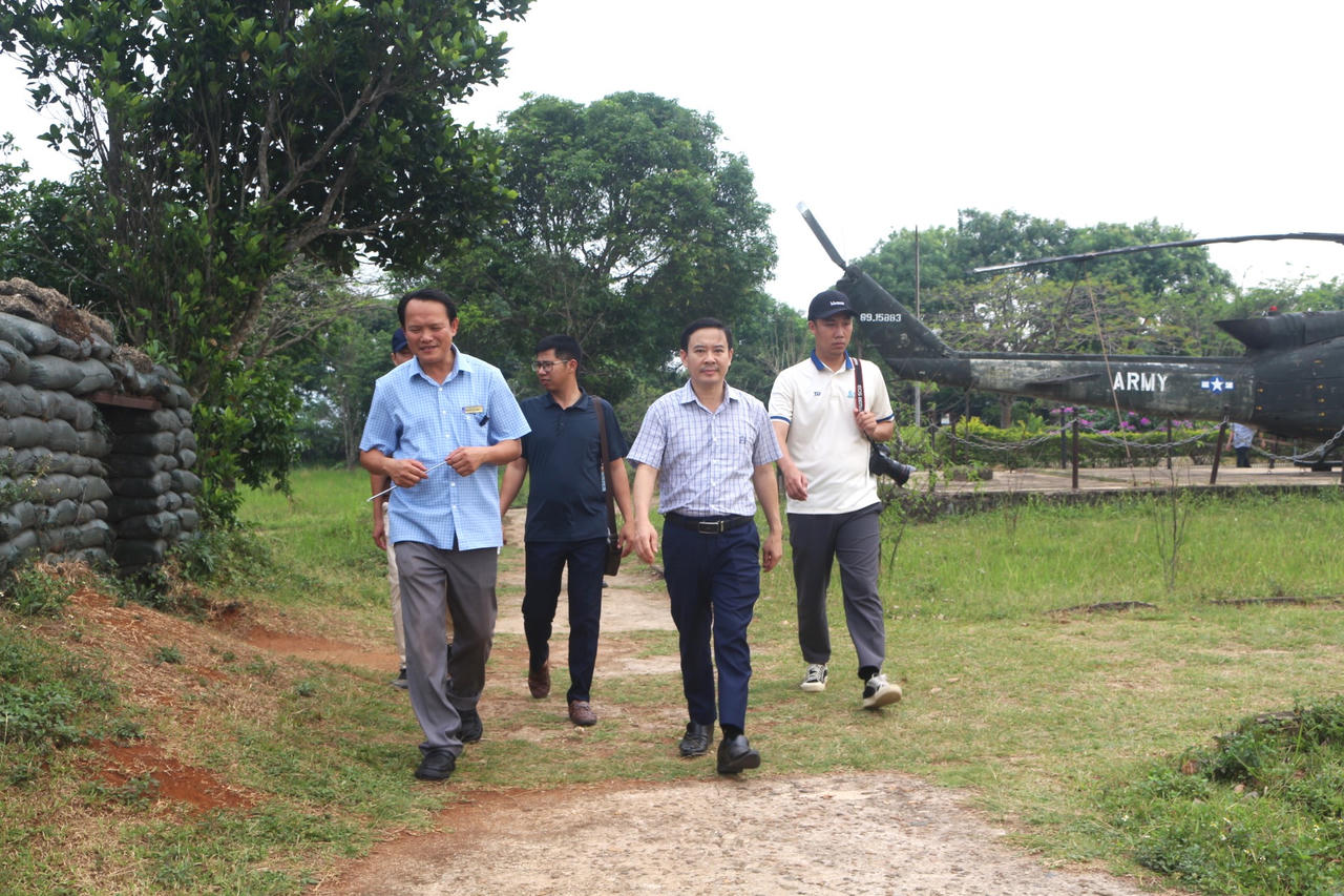 Ông Nguyễn Viết Minh, Phó trưởng Ban quản lý Di tích Sân bay Tà Cơn (áo xanh) giới thiệu hệ thống hiện vật và không gian trưng bày ngoài trời tại khu di tích.