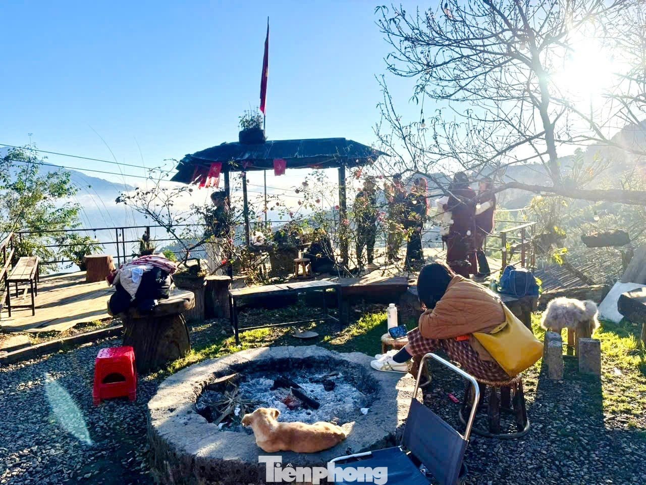 Sức hút của quán nằm ở chiếc mái gỗ chênh vênh, tạo nên bối cảnh chụp ảnh vừa lạ vừa thơ. Chỉ cần khéo léo chọn góc đứng, du khách dễ dàng bắt trọn khung cảnh mây ngàn cuồn cuộn hoặc ráng chiều rực rỡ trên đỉnh núi.