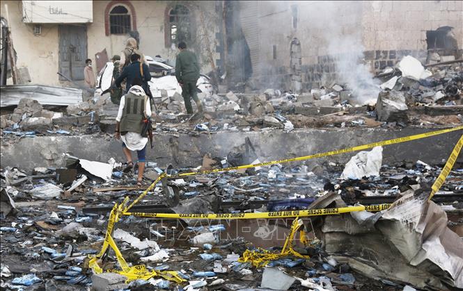 Hiện trường cuộc không kích của Mỹ tại Sanaa, Yemen ngày 20/3/2025. Ảnh: THX/TTXVN