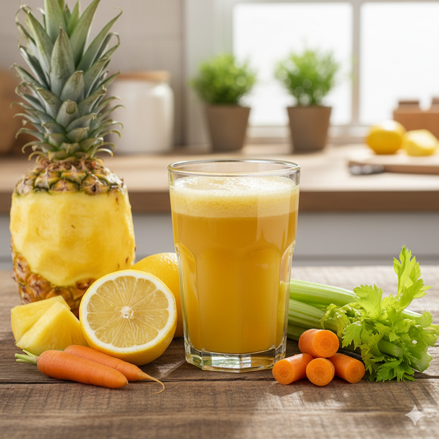 Nước ép từ dứa, cà rốt, cần tây và chanh có thể hỗ trợ giảm viêm, tiêu sưng, tăng tính linh hoạt cho khớp.