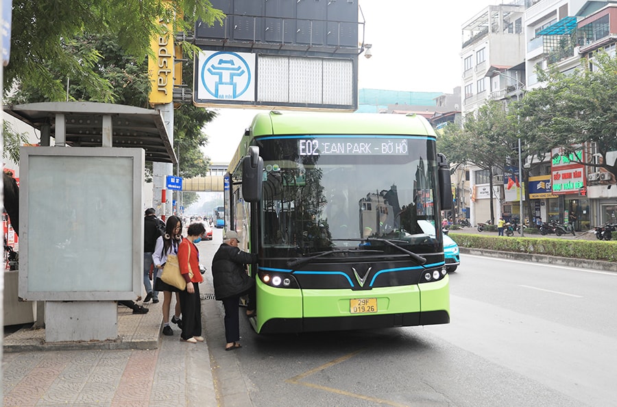 Xe buýt điện đón khách tại điểm dừng, đỗ trên đường Nguyễn Văn Cừ (phường Bồ Đề). Ảnh: Nguyễn Quang