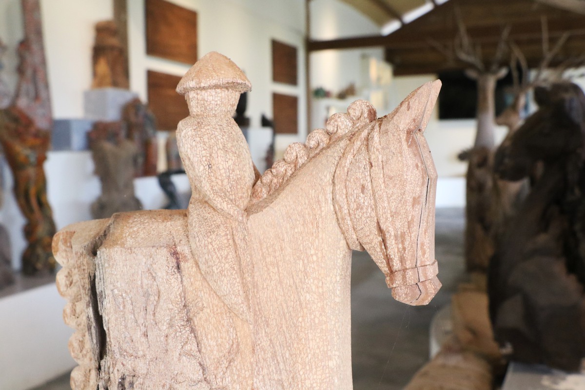 Những chú ngựa gỗ được lau chùi thường xuyên trong không gian trưng bày tại Làng Củi Lũ.
