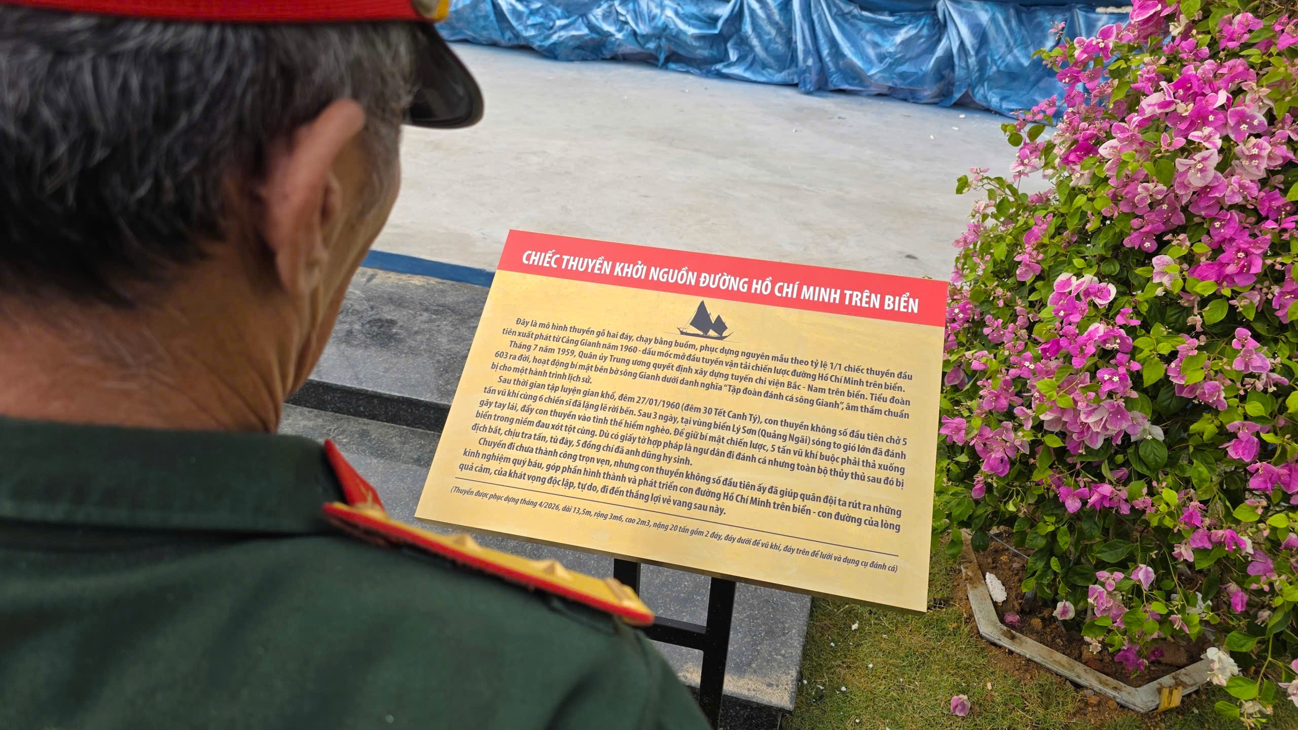 Một cựu chiến binh đọc thông tin về thông số thiết kế tái hiện lại chiếc tàu không số đầu tiên trên biển tại di tích lịch sử. Ảnh: MINH TRƯỜNG