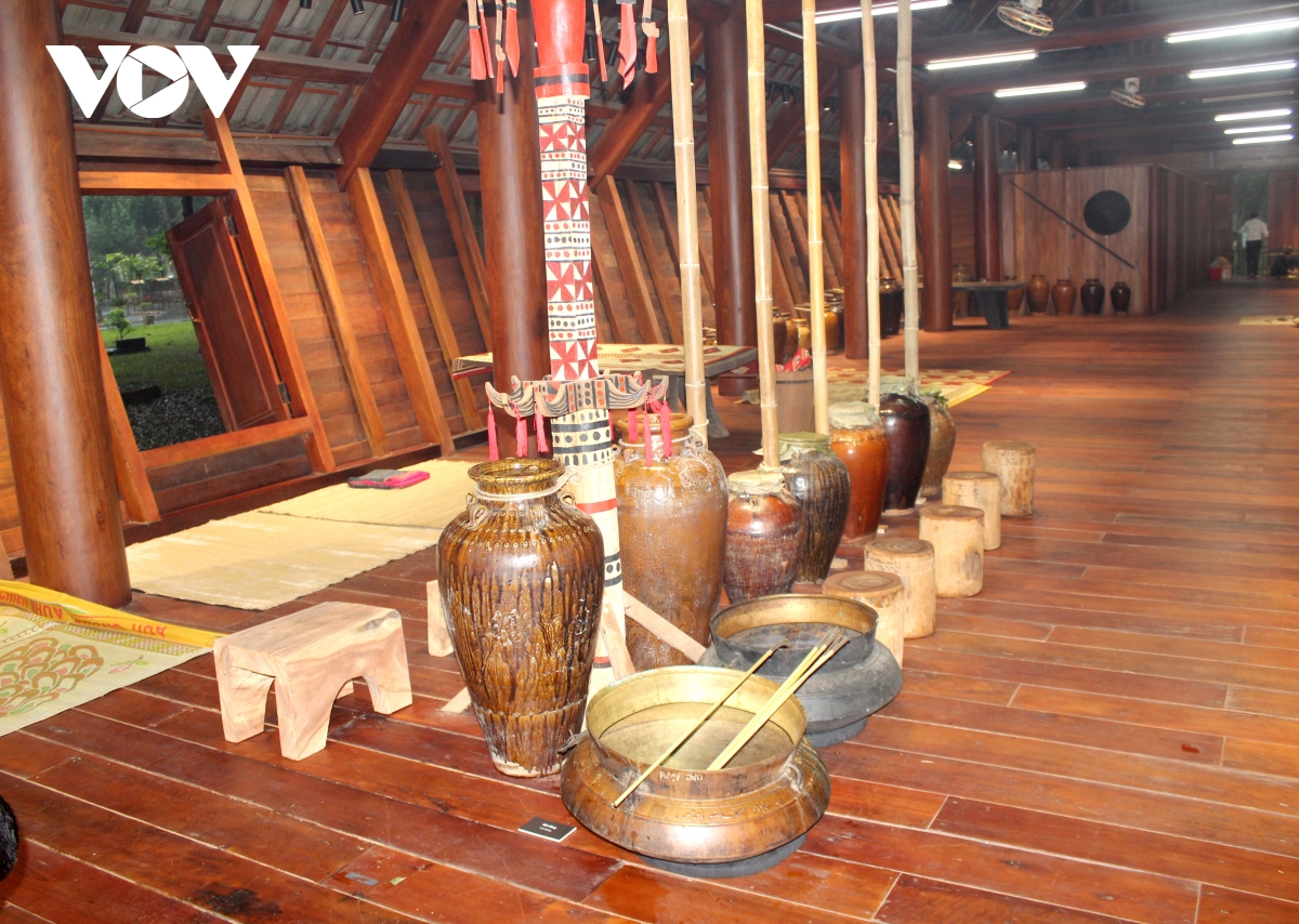 Bên trong nhà dài là không gian truyền thống với nhiều hiện vật trong đời sống, sinh hoạt của người Ê Đê