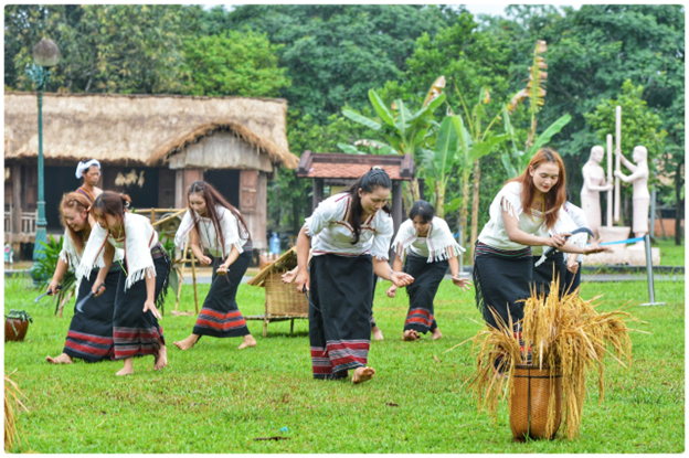 Không chỉ dừng lại ở phần lễ, chương trình tái hiện còn mang đến những lát cắt sinh động về đời sống lao động của người Chu Ru. Các công đoạn thu hoạch lúa truyền thống như gặt, đập, sảy, giã gạo được tái hiện chân thực, giúp người xem hình dung rõ nét về quá trình lao động vất vả nhưng đầy ý nghĩa. Những âm thanh quen thuộc của công cụ lao động, hòa quyện cùng nhịp điệu sinh hoạt cộng đồng, tạo nên một “bản hòa tấu” đậm chất văn hóa núi rừng.