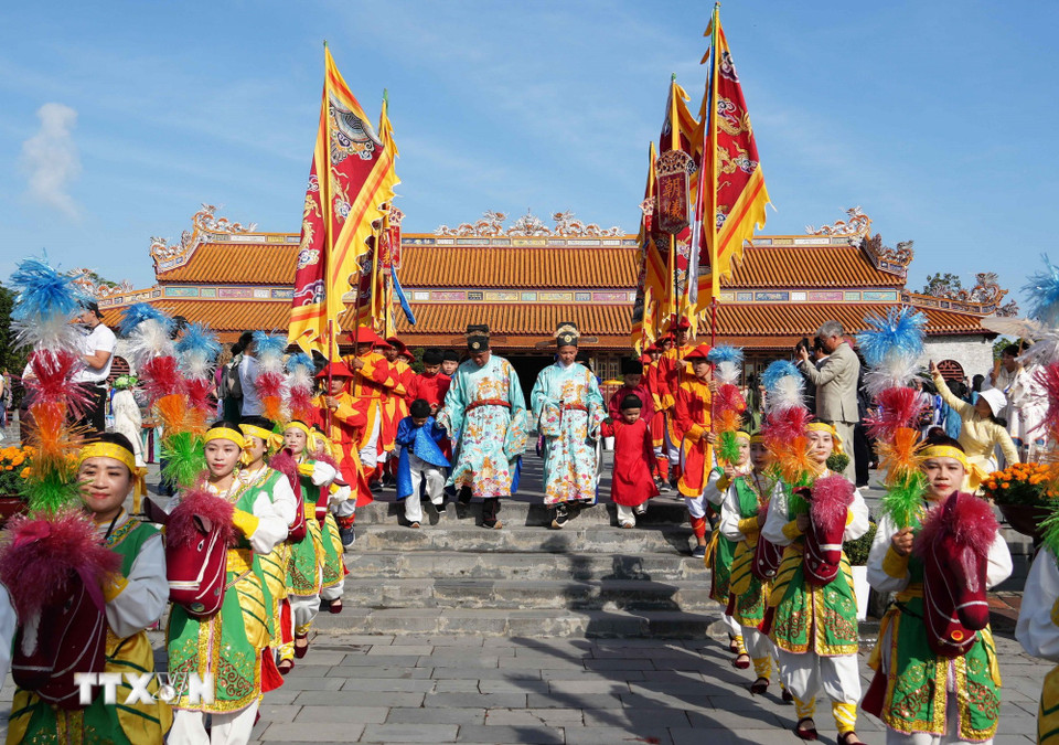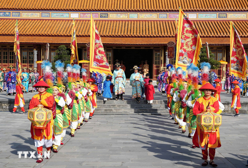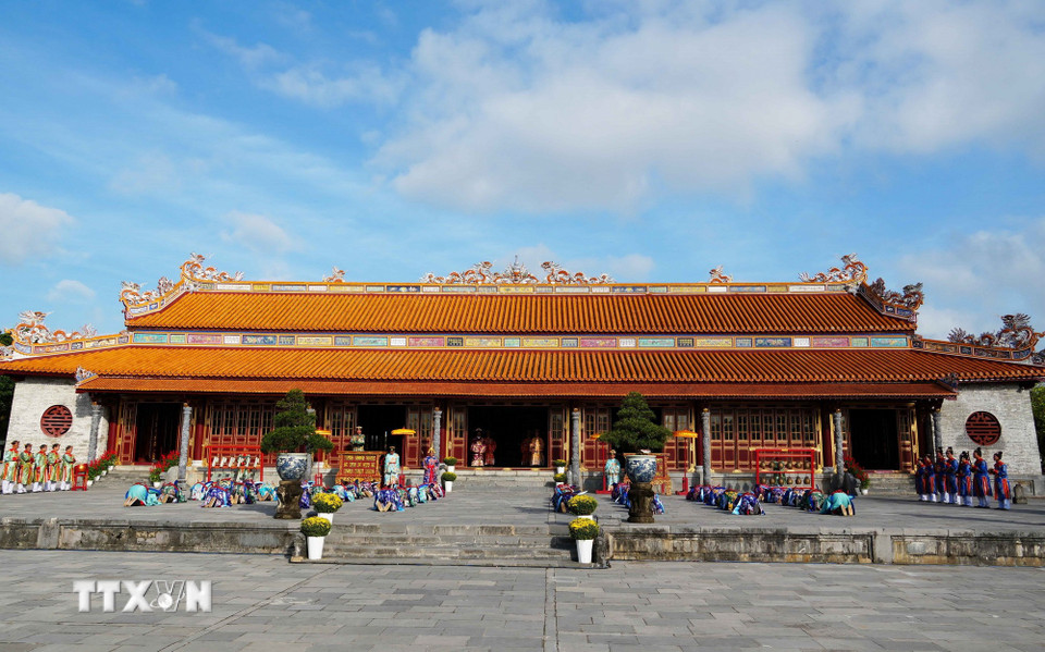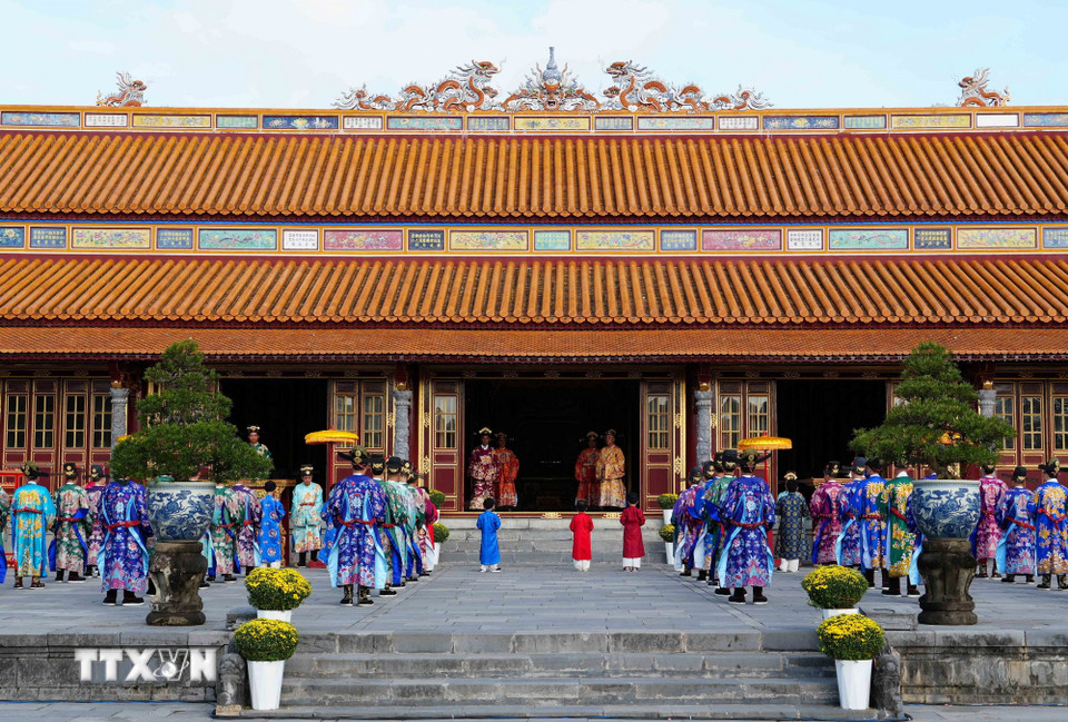 Lễ Thiết triều Nguyên đán triều Nguyễn được tái hiện tại Đại triều Điện Thái Hòa, Đại Nội Huế. (Ảnh: Nguyên Lý/TTXVN)