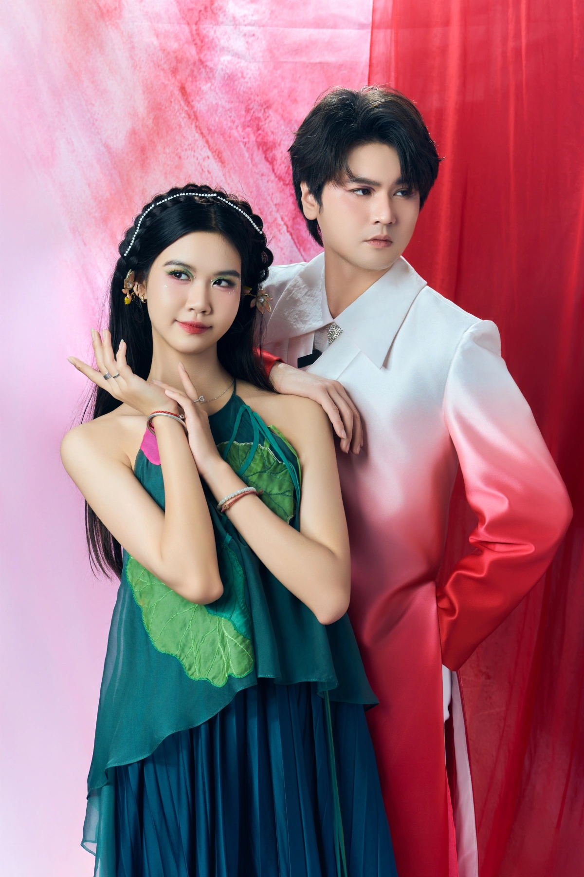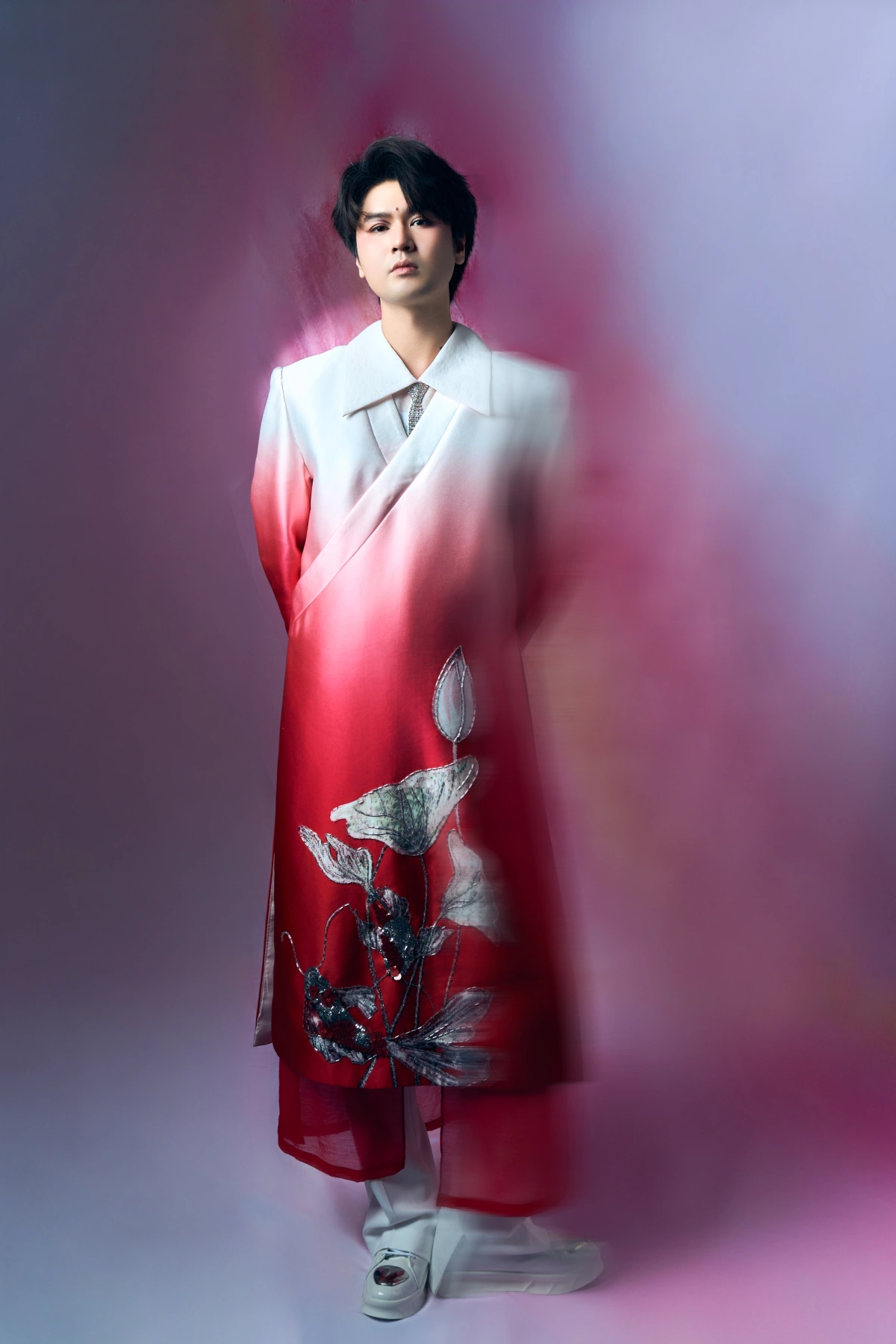 Trong loạt hình, anh cùng các mẫu nhí diện áo dài, áo tứ thân thuộc bộ sưu tập “Tơ sen”, lấy cảm hứng từ kỹ thuật dệt thêu truyền thống và hình tượng hoa sen.