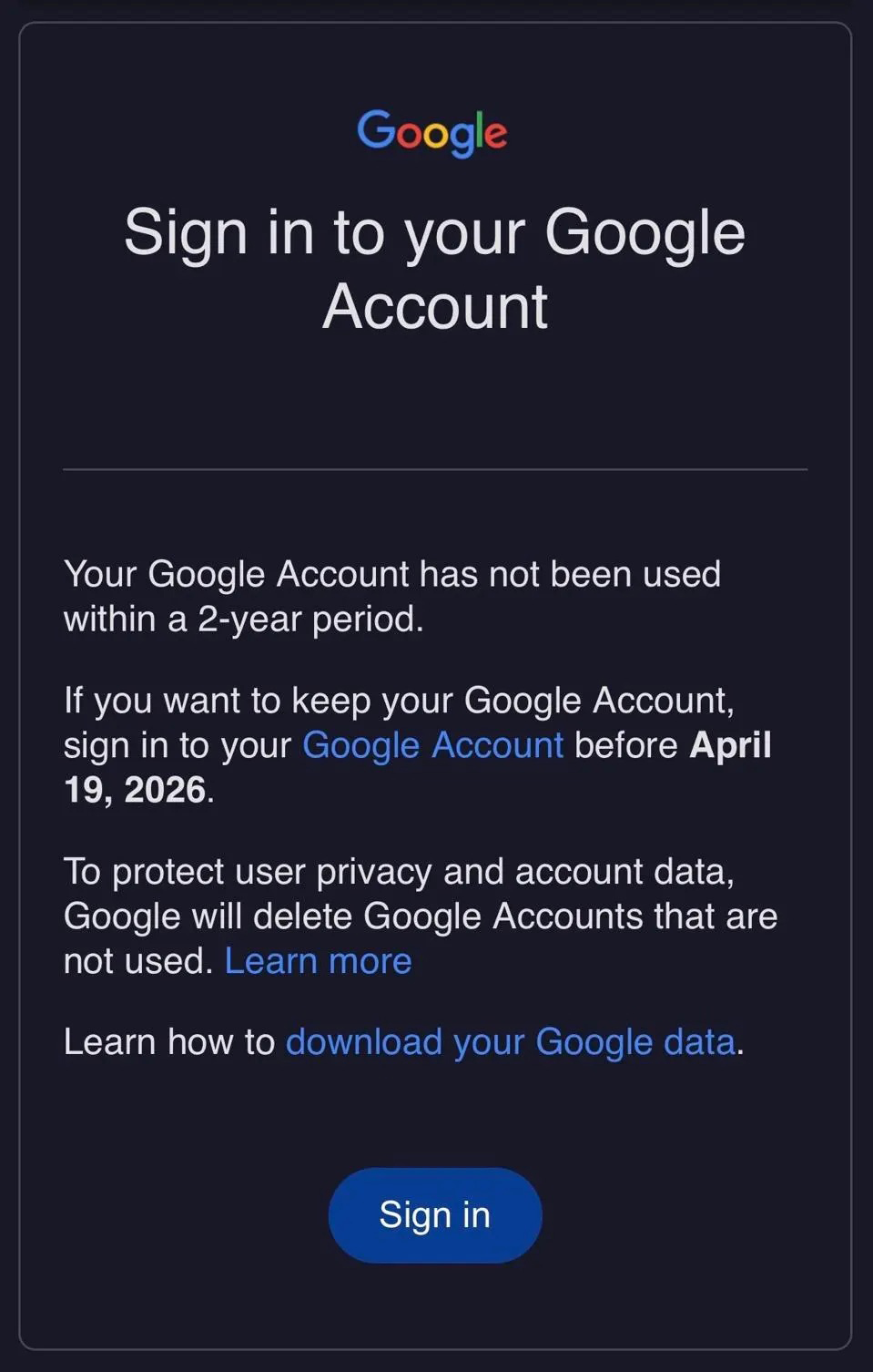 Theo đó, Google sẽ xóa tài khoản nếu người dùng không đăng nhập hoặc sử dụng trong ít nhất hai năm. Khi tài khoản bị xóa, mọi dữ liệu liên quan như Gmail, Drive, Photos, Google Play và các dịch vụ khác đều sẽ bị xóa theo.