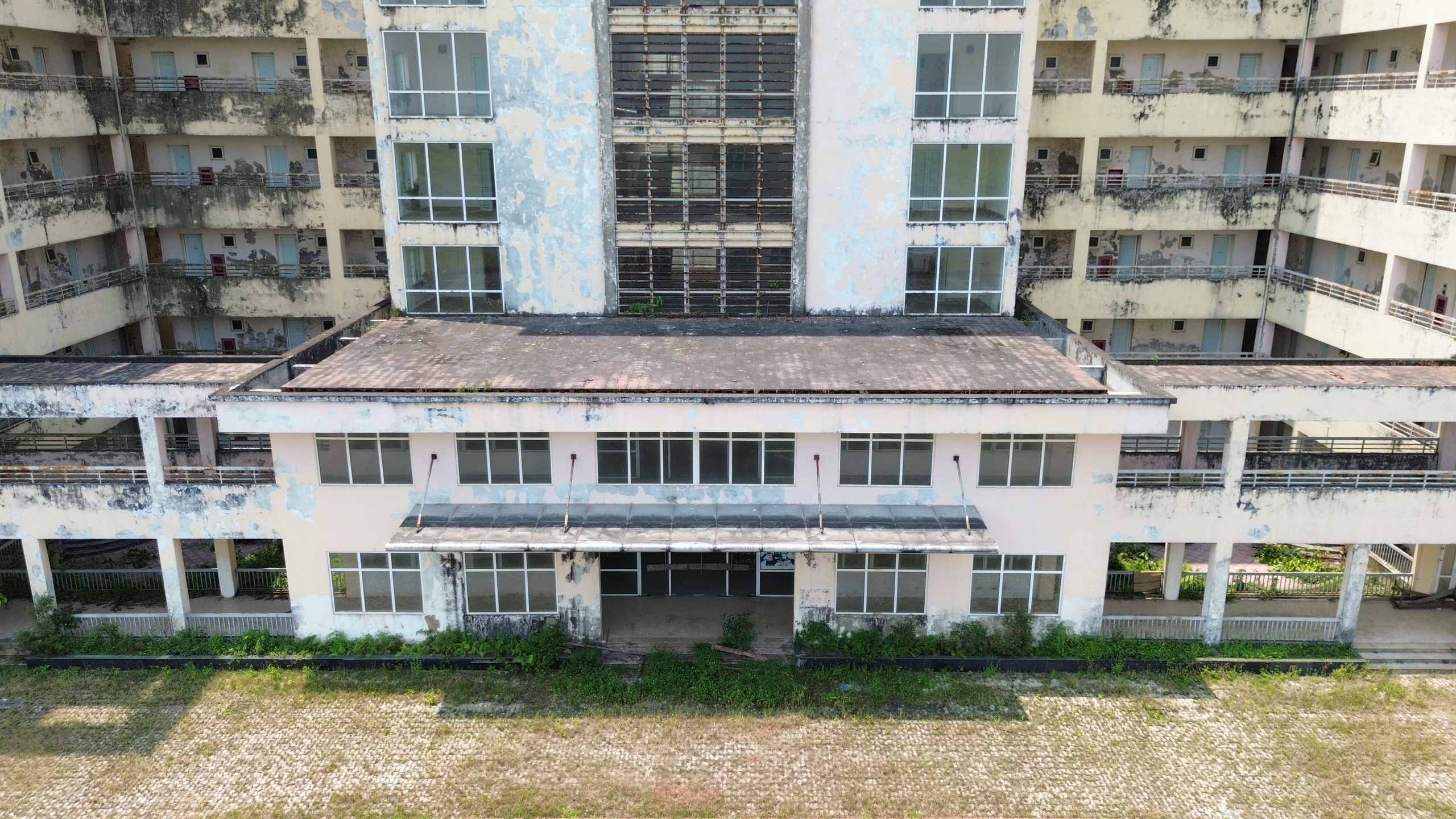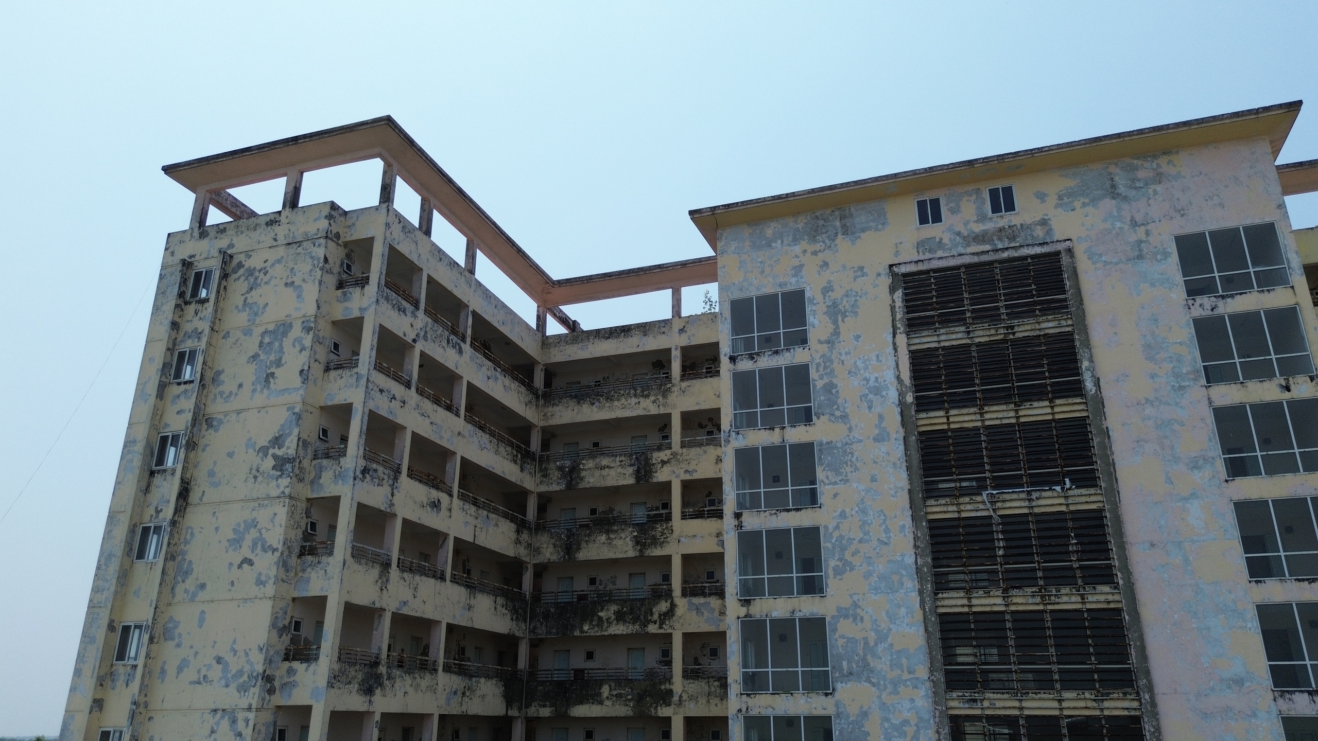 Nhìn bên ngoài tòa nhà, các mảng tường xuống cấp, lớp sơn bị bong tróc, rêu bám dày…
