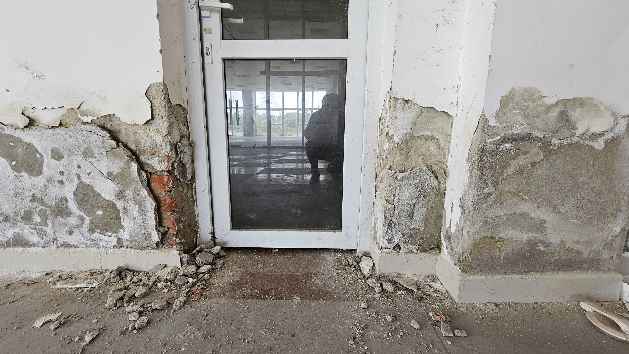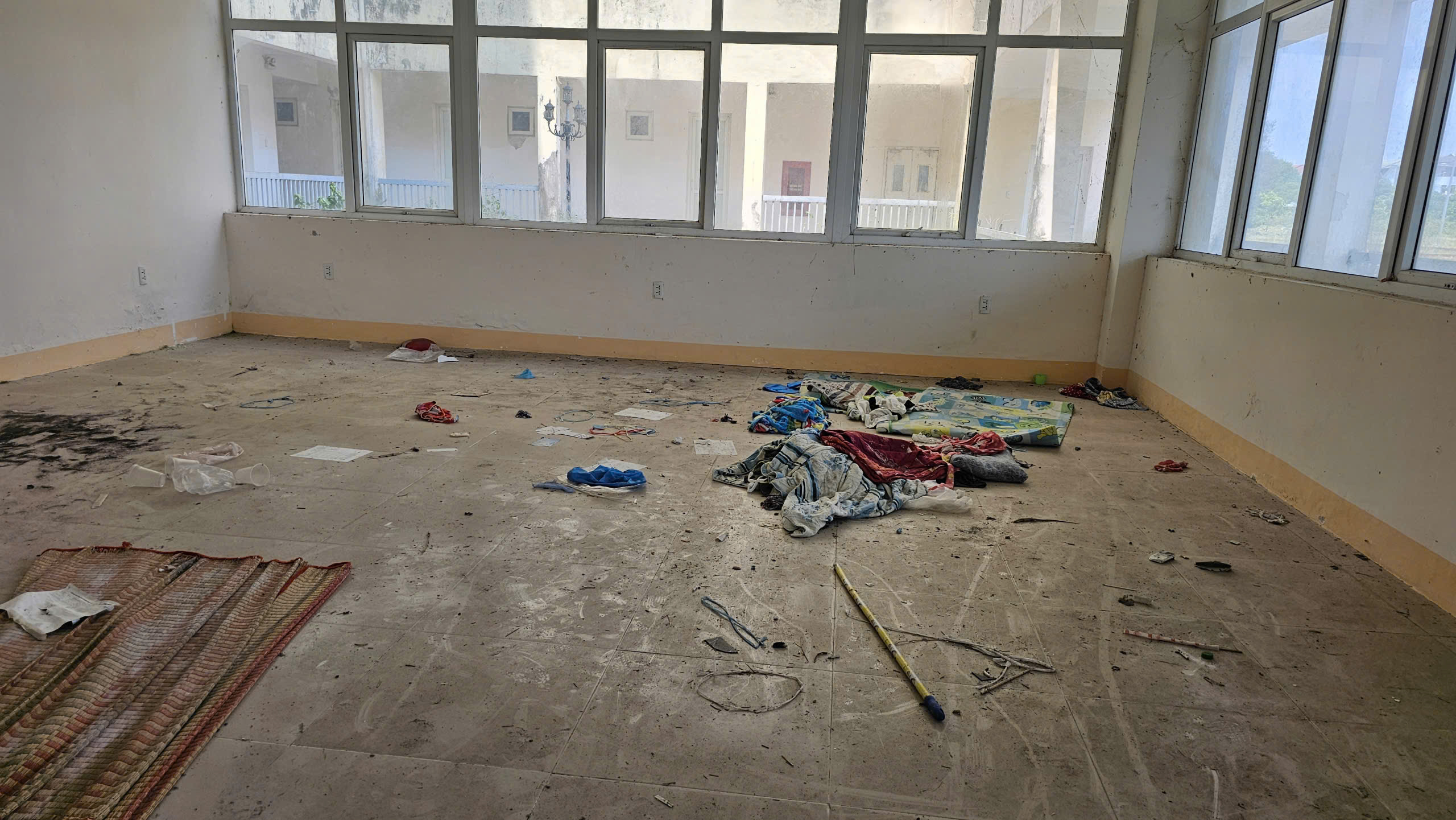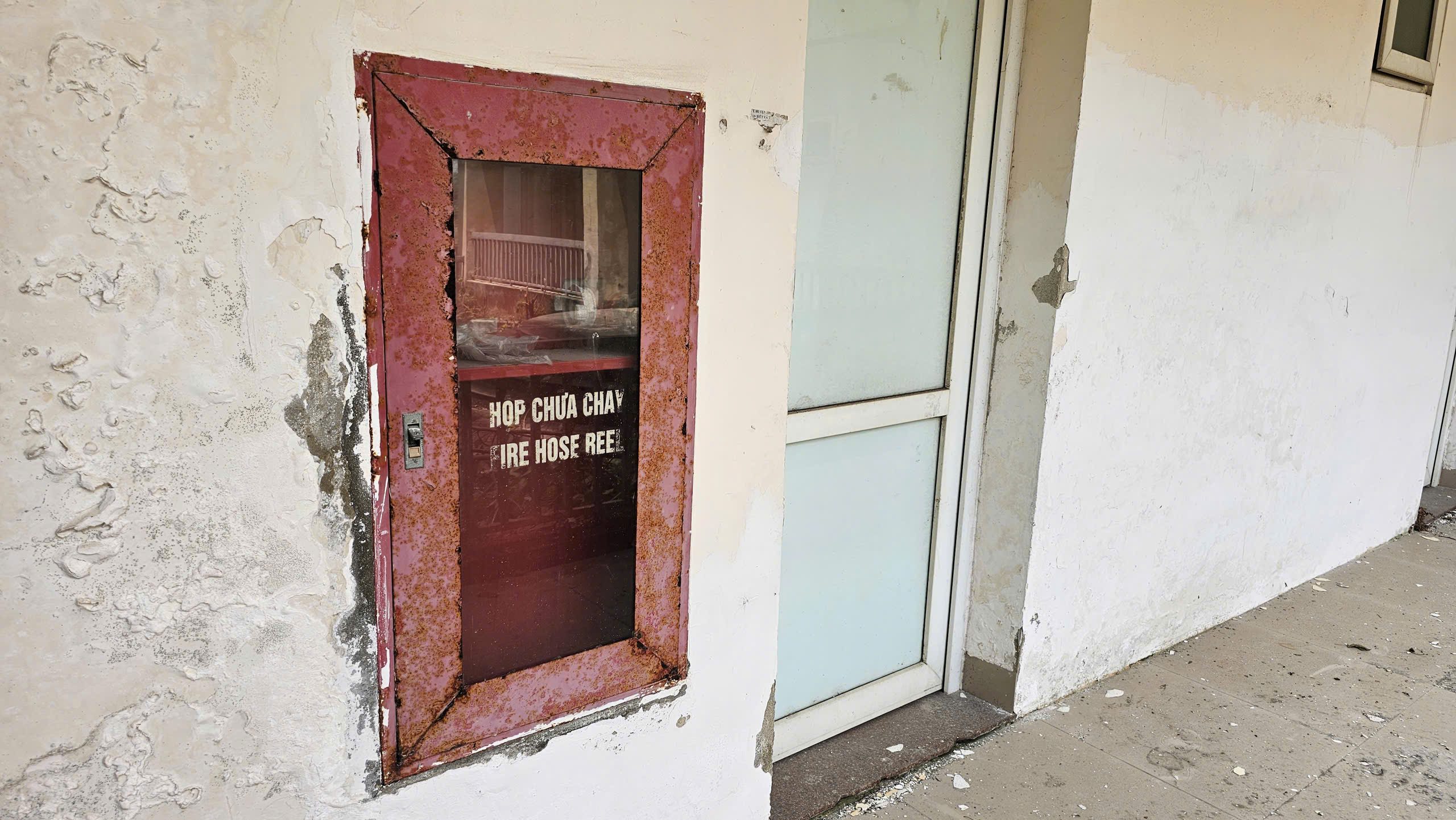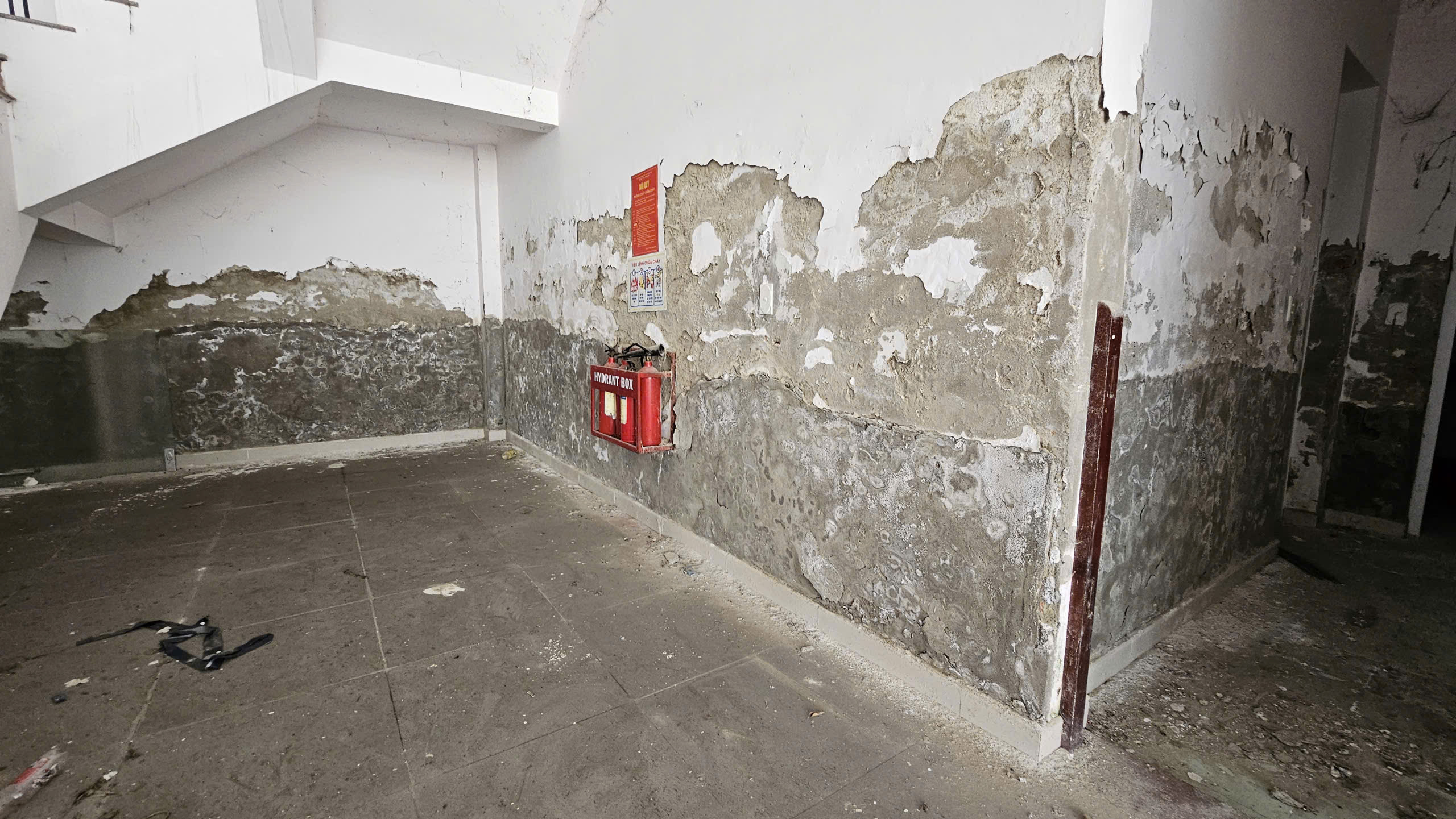 Khu vực tiền sảnh, cầu thang dẫn lên các tầng bao phủ đầy bụi, hệ thống cửa phòng, thang máy, phòng cháy chữa cháy… hư hỏng, xuống cấp.