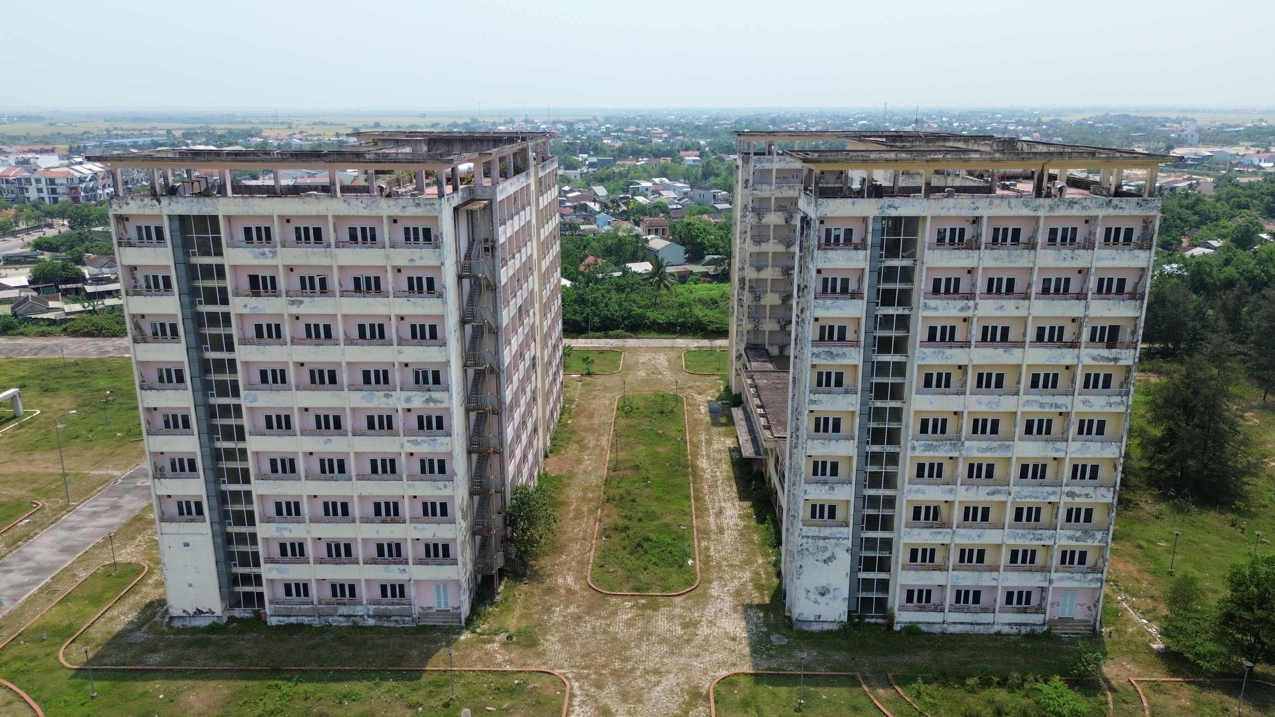 Theo ghi nhận của PV Báo Xây dựng, cả hai dự án đều xây dựng dang dở rồi bỏ hoang 15 năm nay, cỏ dại mọc um tùm cả khuôn viên dự án và ăn vào hành lang tòa nhà.