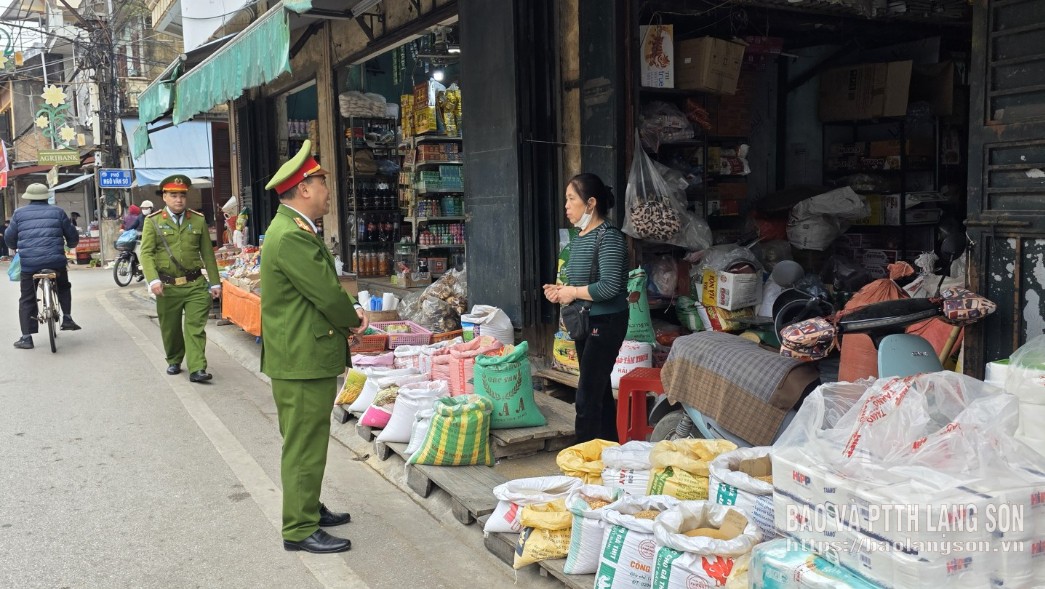 Công an phường Kỳ Lừa nhắc nhở các hộ kinh doanh sắp xếp hàng hóa gọn gàng, bảo đảm đường thông hè thoáng