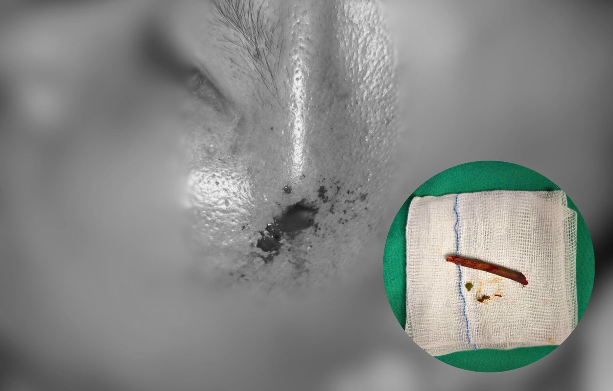 Các bác sĩ lập tức hội chẩn liên chuyên khoa và quyết định phẫu thuật khẩn cấp. Sau khi gây mê, ê-kíp tiến hành thám sát, lấy ra dị vật là nhánh cây dài khoảng 6 cm, đồng thời làm sạch mô mềm, loại bỏ nhiều dằm gỗ và lá cây còn sót lại.