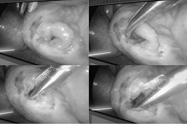 Ê-kíp tiến hành cắt lọc tổ chức dập nát và khâu phục hồi lỗ thủng hoàn toàn bằng phương pháp nội soi. Đồng thời, toàn bộ ổ bụng được kiểm tra kỹ lưỡng để tránh bỏ sót tổn thương các tạng khác – điều đặc biệt quan trọng trong chấn thương bụng do tai nạn giao thông.