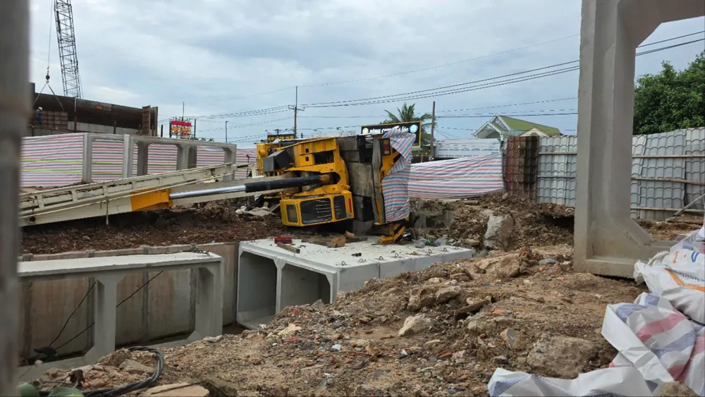 Hiện trường vụ tai nạn lao động tại công trình thi công mương nước dưới cầu vượt cao tốc Biên Hòa - Vũng Tàu, cần cẩu sập đè trúng một công nhân khiến nạn nhân tử vong. Ảnh: VŨ HỘI
