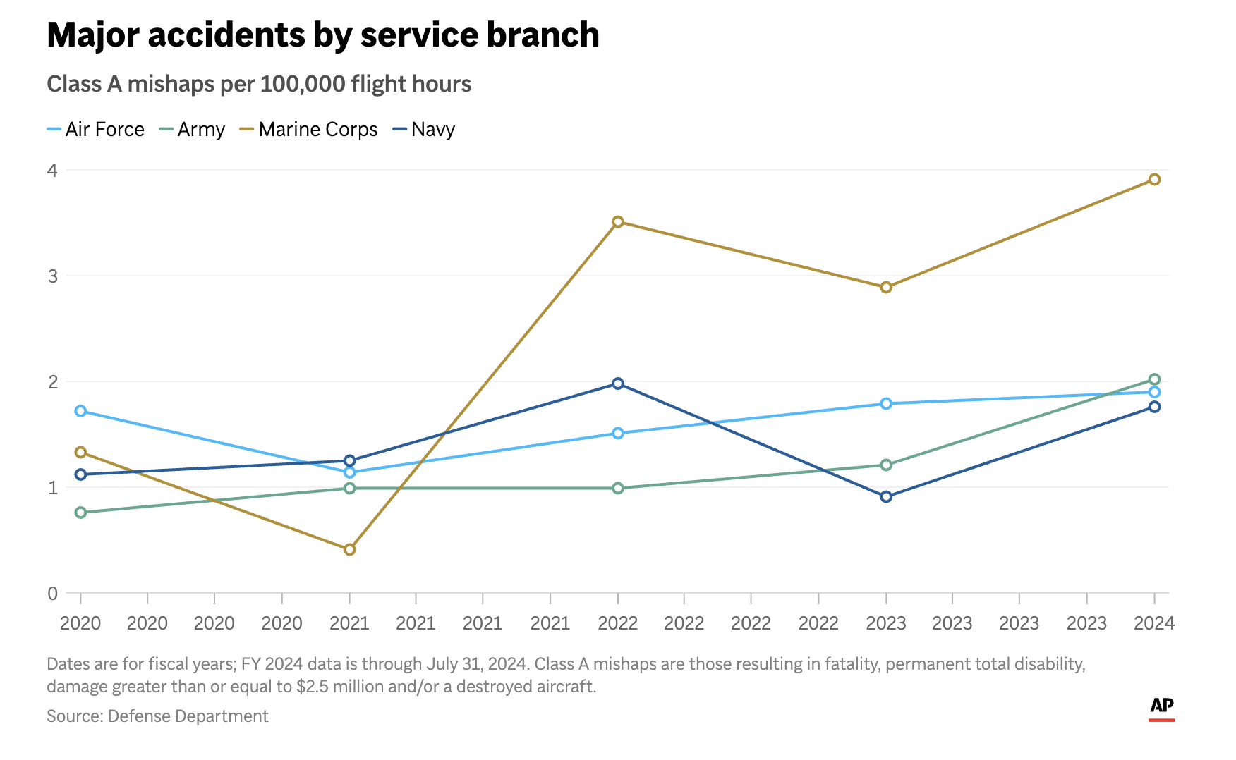 Tính trên toàn quân, tỷ lệ tai nạn nghiêm trọng trên mỗi 100.000 giờ bay đã tăng 55% trong năm tài khóa 2024 so với 4 năm trước đó. Thủy quân lục chiến ghi nhận mức tăng mạnh nhất, gần gấp ba lần.
