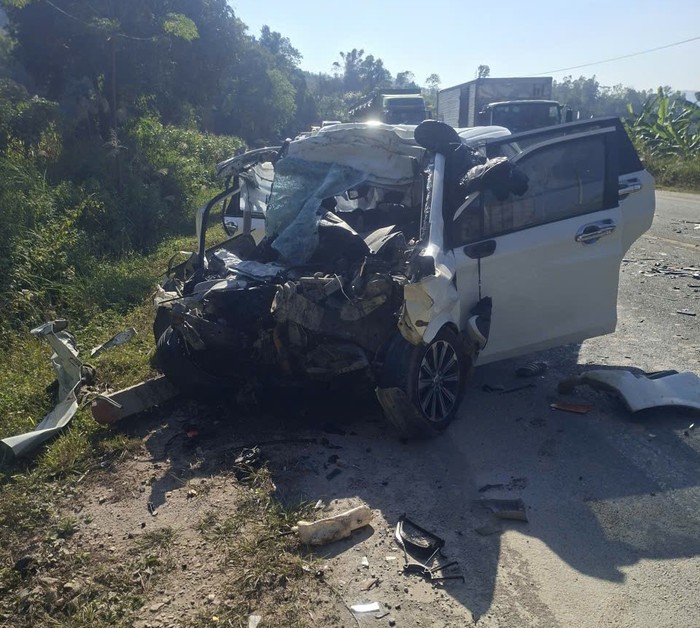 Xe ô tô chở khách hư hỏng nặng, đầu gần như nát bươm