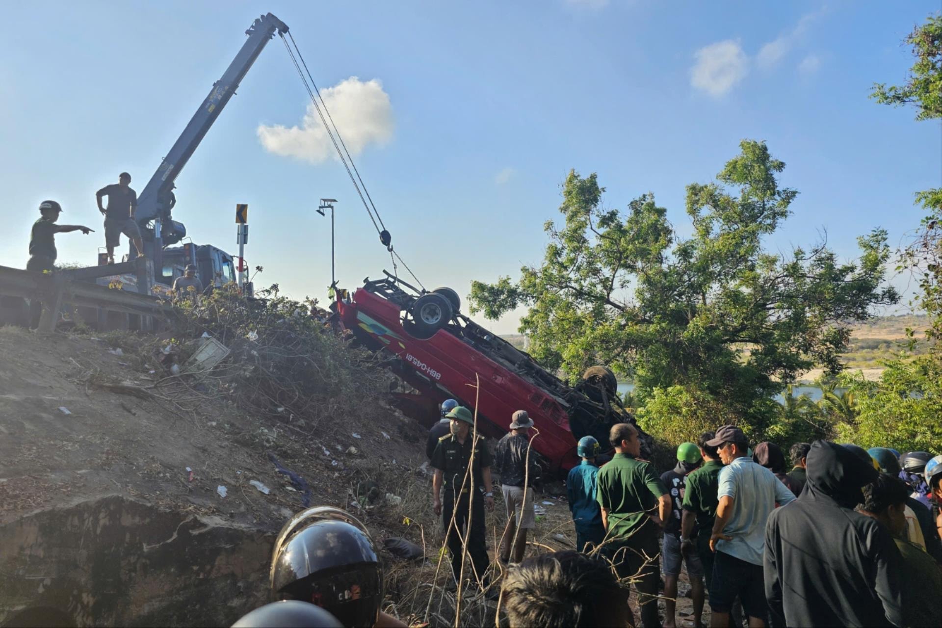 Tại hiện trường, xe khách (loại xe 29 chỗ) mang biển số 86H-045XX gãy nát. Thời điểm xảy ra tai nạn, trên xe có 16 hành khách. Lực lượng chức năng đang huy động xe cẩu đưa phương tiện lên, đồng thời tổ chức tìm kiếm thêm 2 người nghi mất tích.