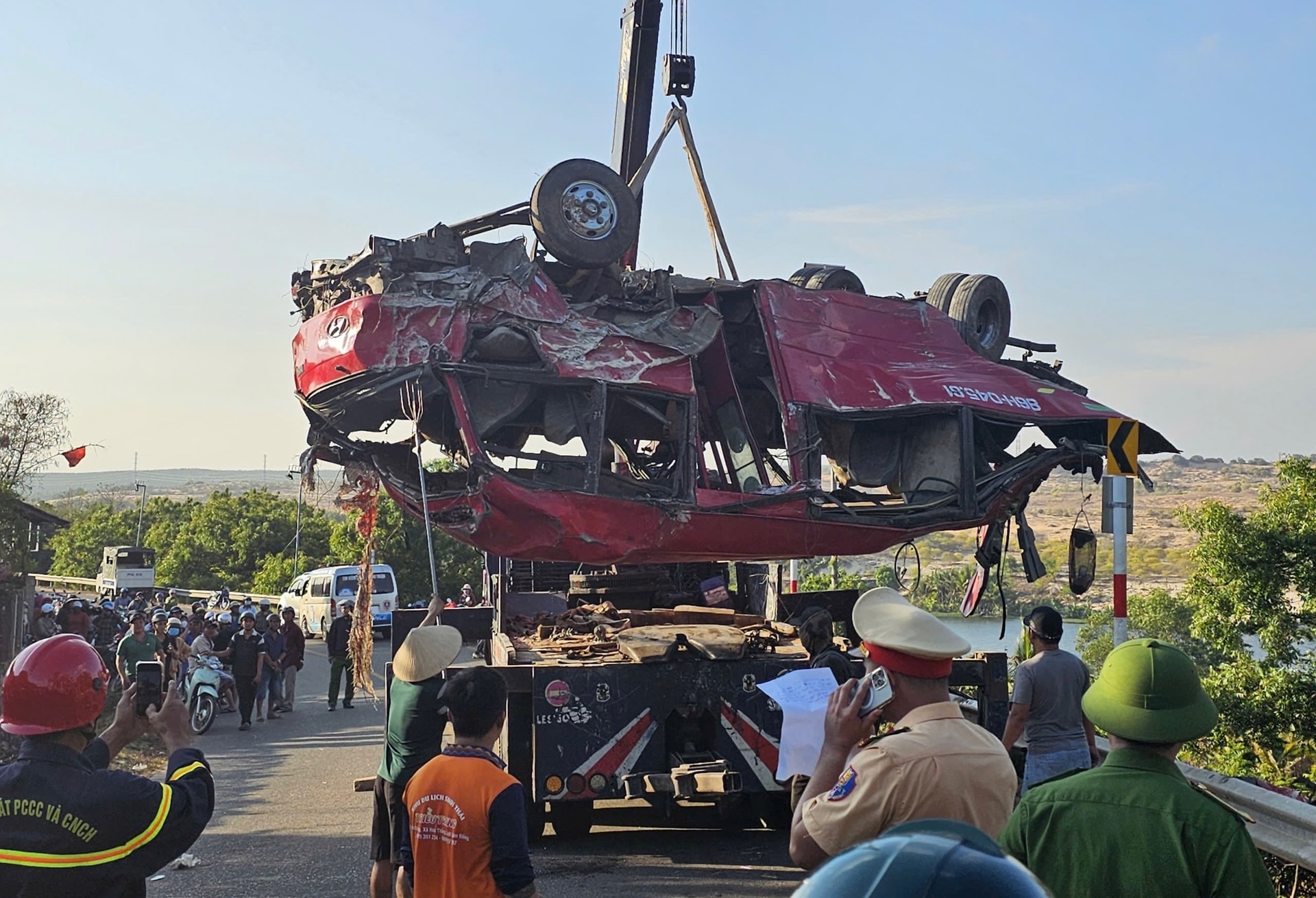 Lực lượng chức năng cẩu xe khách bị tai nạn lên mặt đường để phục vụ công tác điều tra