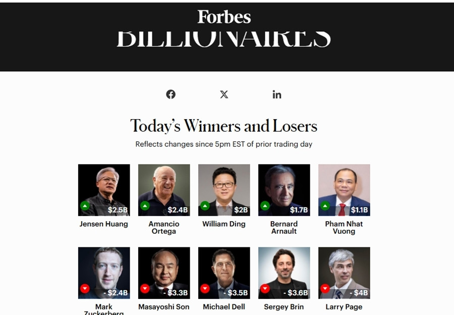 Tỷ phú Phạm Nhật Vượng lọt top 5 tỷ phú gia tăng khối tài sản nhiều nhất thế giới trong ngày. (Ảnh chụp màn hình)