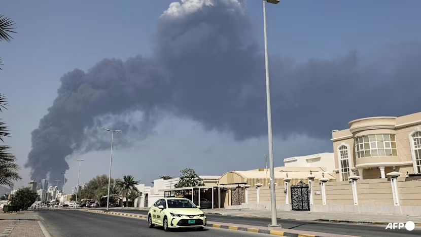 Khói bốc lên từ khu vực một cơ sở năng lượng tại tiểu vương quốc Fujairah, thuộc Các Tiểu vương quốc Ả Rập Thống nhất (UAE) ngày 14-3. Ảnh: AFP