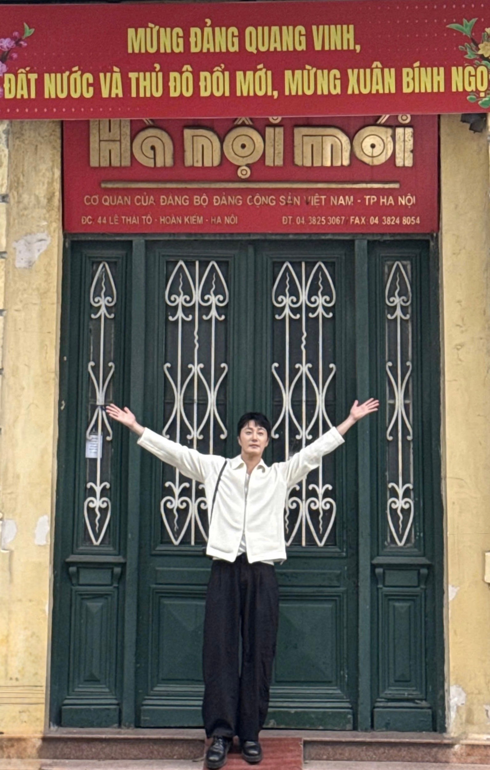 Nam diễn viên check-in trước cửa Tòa nhà số 44 Lê Thái Tổ (Hoàn Kiếm, Hà Nội). Ảnh: NVCC