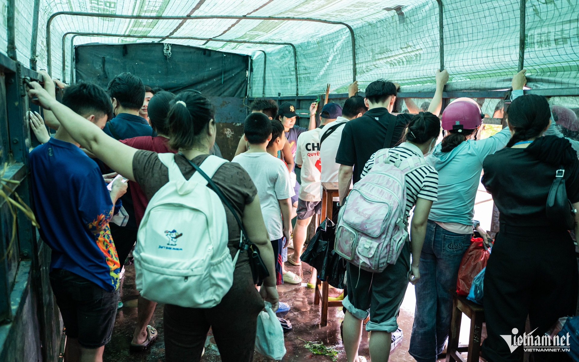 Người dân trèo lên ghế để lên xe tải. Ảnh: Nguyễn Huy
