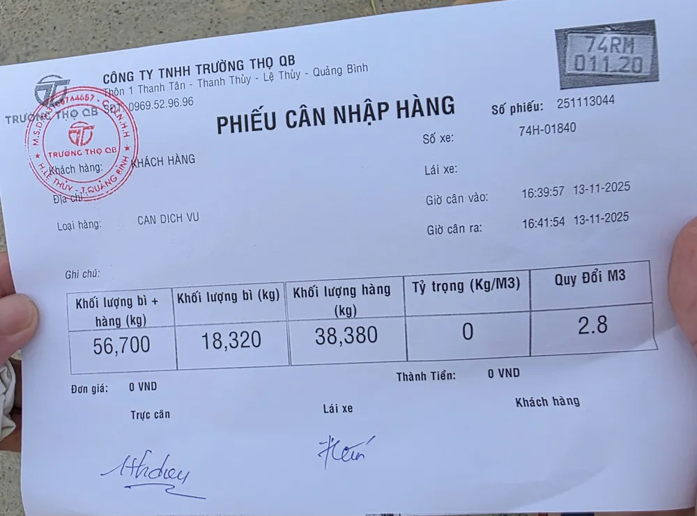 Qua cân tải, số liệu tổng trọng lượng gồm trọng tải của xe và của hàng hóa là 56,7 tấn. Trong đó, khối lượng cát trên xe là 38,4 tấn, có dấu hiệu vượt tải trọng cho phép.