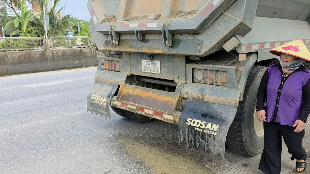 Tài xế dừng xe đổ hết cát ướt xuống đất để tránh cân tải trọng. Ảnh: MINH TRƯỜNG.
