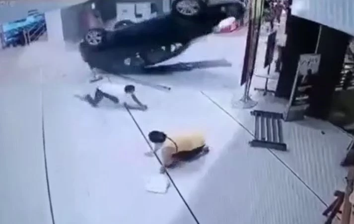 Hình ảnh từ camera an ninh cho thấy một nhóm nhân viên và khách hàng đang đứng ở sảnh tầng 1 thì bất ngờ chiếc xe từ tầng 2 lao thẳng xuống. Trước đó, xe đã lùi nhanh trong bãi đỗ, vượt qua lan can kính rồi rơi mạnh xuống khu vực phía dưới.