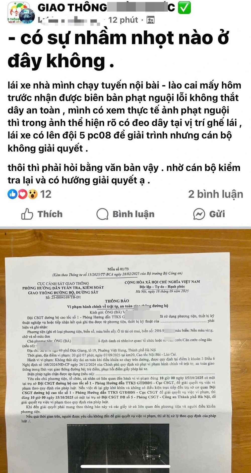 Cụ thể, nội dung bài viết đăng tải: "Lái xe nhà mình chạy tuyến cao tốc Nội Bài - Lào Cai, mấy hôm trước nhận được biên bản phạt nguội lỗi không thắt dây an toàn. Mình có xem thực tế ảnh phạt nguội thì trong ảnh thể hiện rõ lái xe có đeo dây an toàn tại vị trí ghế lái. Thôi thì phải hỏi bằng văn bản vậy, nhờ cán bộ kiểm tra lại và có hướng giải quyết".