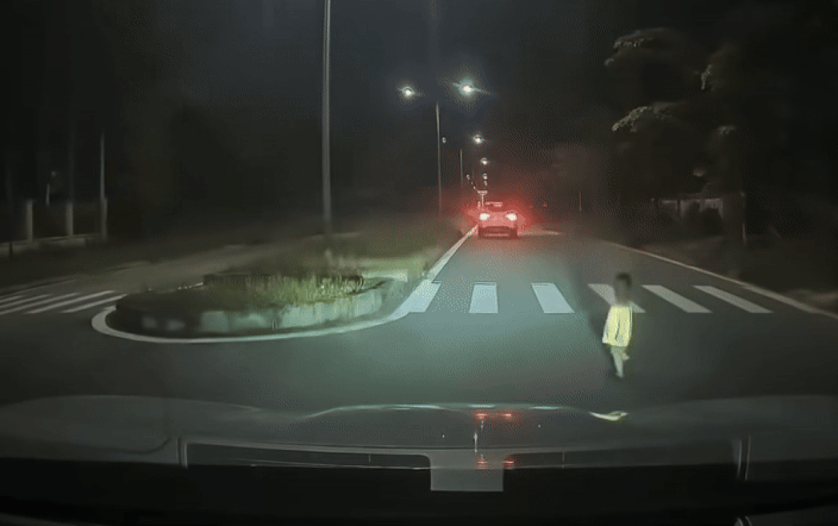 Một bé trai bất ngờ băng qua đầu xe khi tài xế đang điều khiển ô tô trên đường. May mắn, tài xế đã kịp thời xử lý tình huống. Ảnh cắt từ clip/Nguồn: Hóng Đường Phố