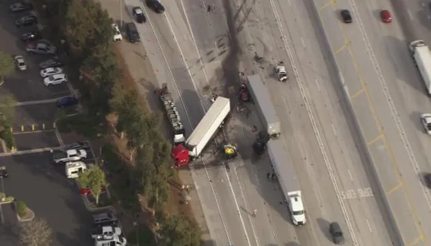 Theo tờ Los Angeles Times, tổng cộng 8 xe, gồm 4 xe tải và 4 xe ô tô, đã bị xe đầu kéo tông trúng. Một xe trong số đó bị cháy rụi.