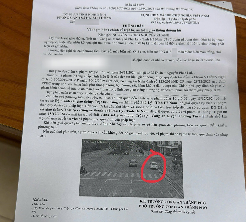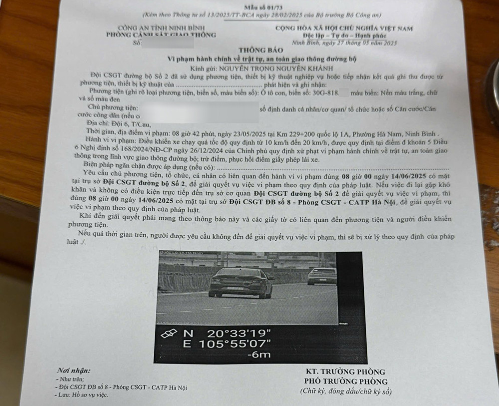 Thắc mắc về 2 lỗi phạt nguội này, chủ phương tiện đã đến Đội CSGT đường bộ số 8 (Phòng CSGT Công an Hà Nội) để xem hình ảnh vi phạm. Tuy nhiên, thông báo phạt nguội có hình ảnh của 2 ô tô khác nhau. Một chiếc mang nhãn hiệu Kia vi phạm lỗi vượt quá tốc độ cho phép, còn chiếc kia nhãn hiệu Hyundai vi phạm lỗi không chấp hành tín hiệu đèn.