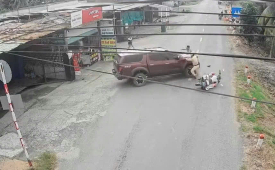 Hình ảnh tài xế lái ô tô bán tải lao thẳng vào mô tô CSGT rồi bỏ trốn. (Ảnh cắt từ clip)
