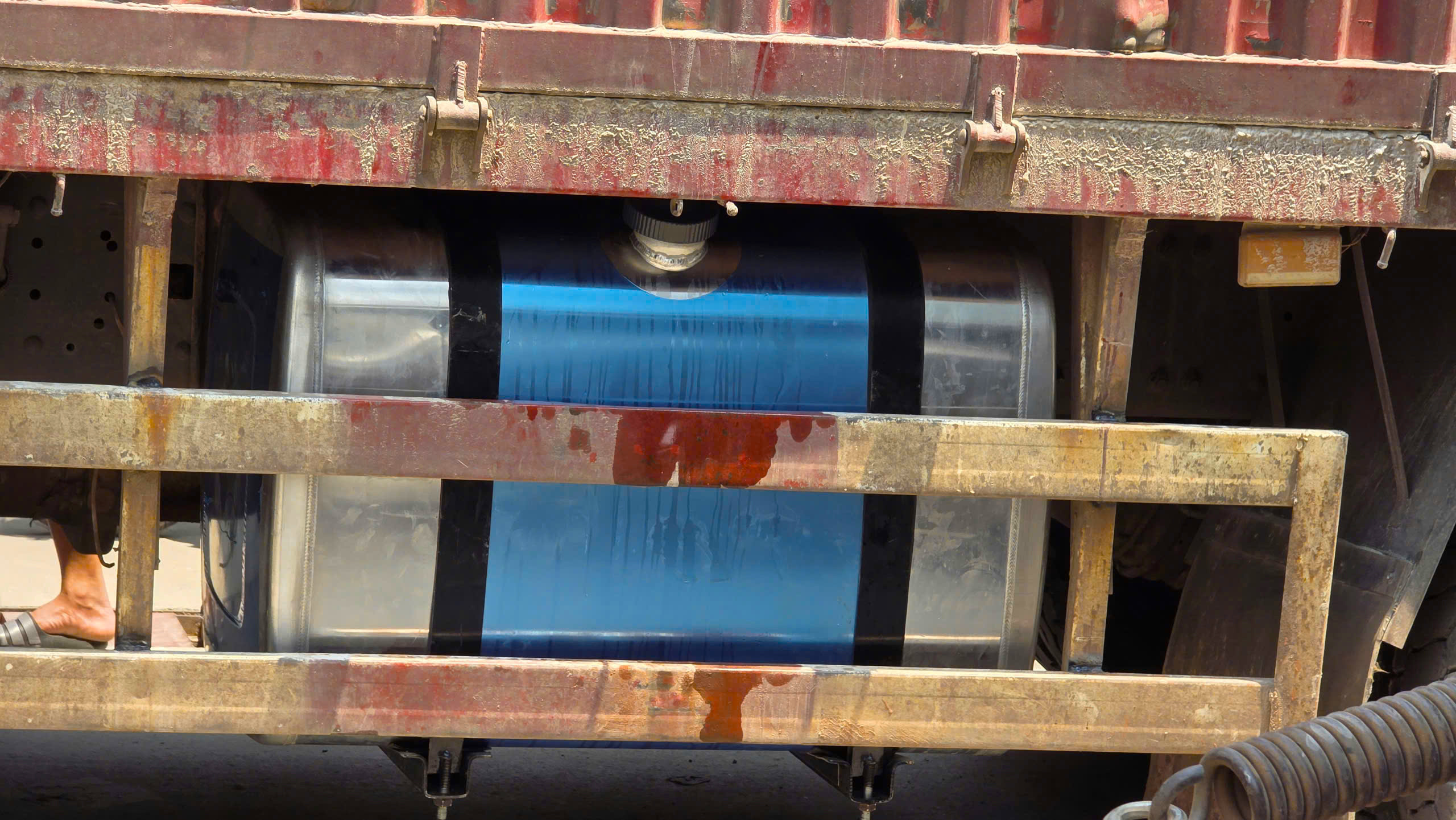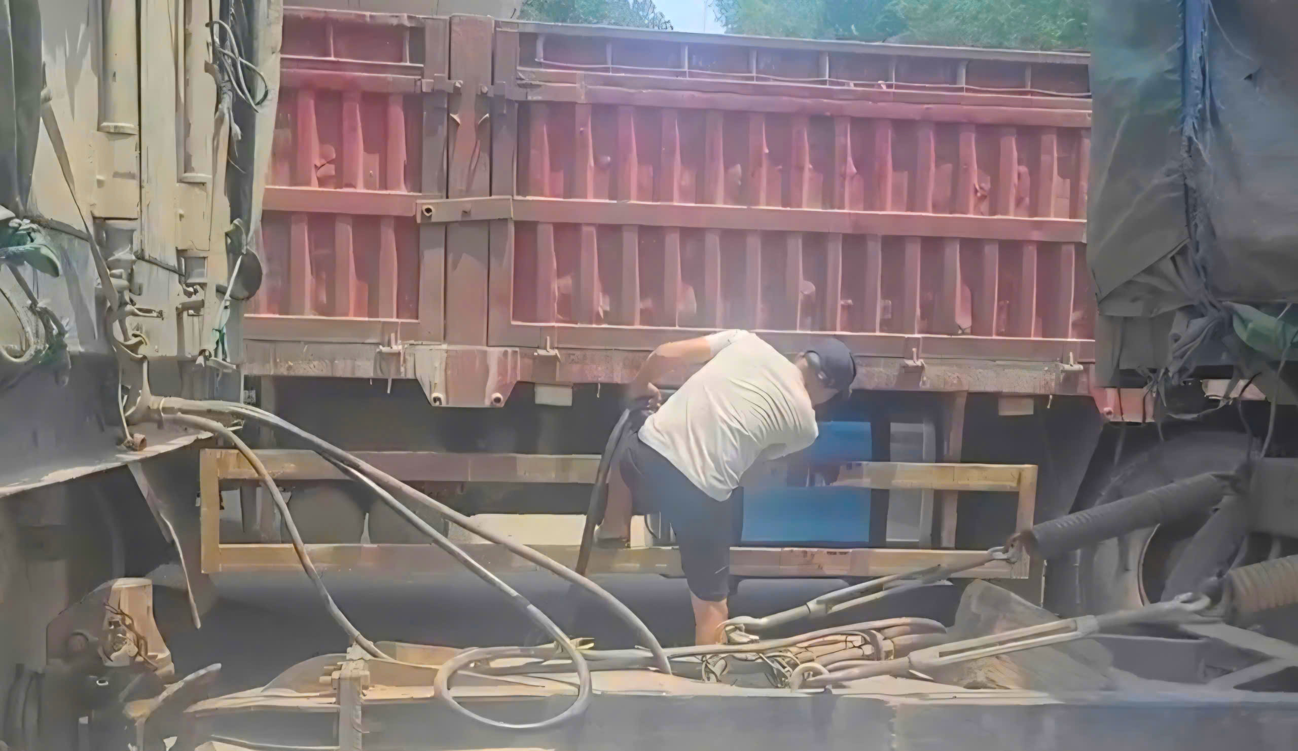 Tài xế xe tải bơm dầu vào một thùng bằng inox gắn dưới gầm xe để chở sang Lào. Ảnh: MINH TRƯỜNG.